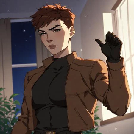 1girl, solo, big breasts, shirt, short hair, brown hair, black shirt, gloves, open jacket, brown eyes, open clothes, belt,