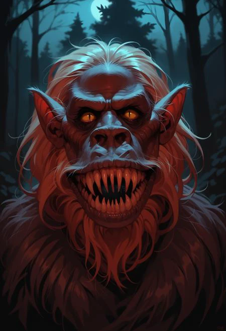 monster, teeth, sharp teeth, no humans, pointy ears, claws, yellow eyes, slit pupils, full body