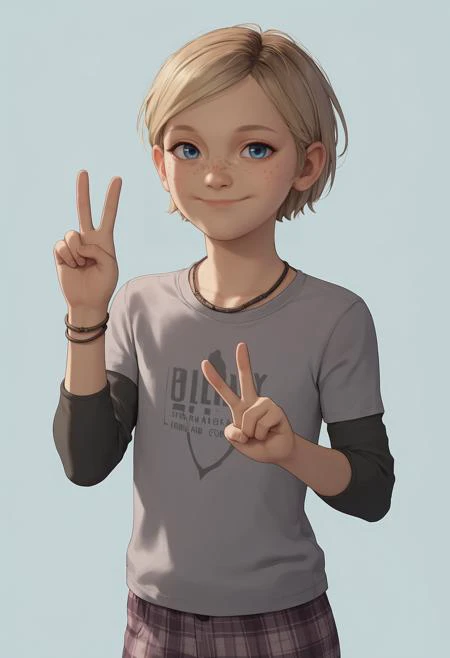 1girl, short hair, blonde hair, freckles, blue eyes, shirt, necklace, t-shirt, short over long sleeves, print shirt, layered sleeves, bracelet, barefoot