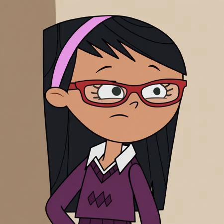 1girl, solo, JenniferShope, black hair, long hair, tan, hairband, glasses, red-framed eyewear,