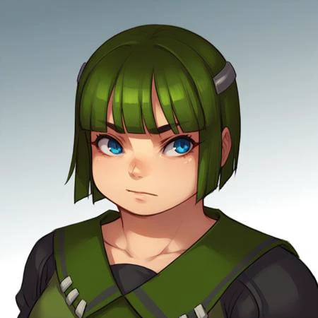 Bulkhead, 1girl, solo, green hair, short hair, bob cut, blue eyes, school uniform, skirt, thighhighs,
