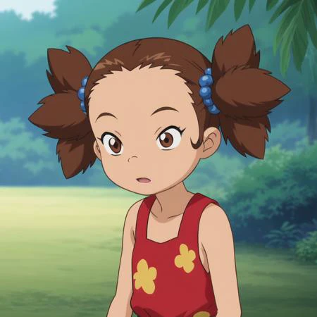 YunaKamihara, 1girl, solo, brown hair, twintails, brown eyes, hair beads, red dress sandals blue pantyhose