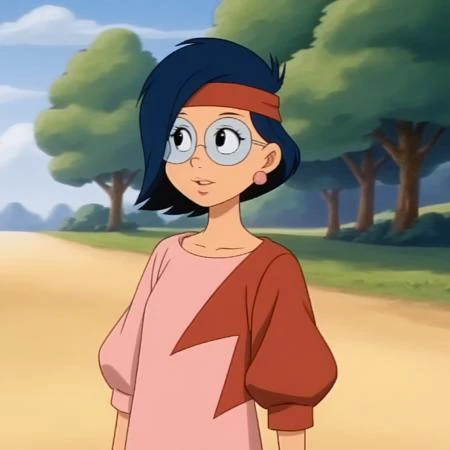 annie, 1girl, solo, short hair, blue hair, black eyes, headband, glasses, earrings, shirt, red pants pink footwear mismatched red sleeves