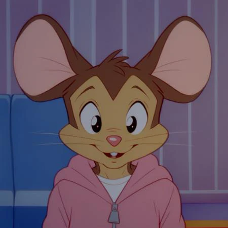 Roy, 1boy, solo, furry, mouse ears, black eyes, white shirt, pink hoodie, zipper blue pants, tail, white footwear