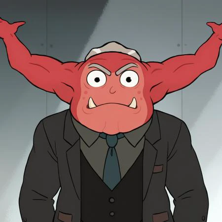 MORTYJR, 1boy, solo, colored skin, black eyes, red skin, suit, necktie, red shirt, pants shoes