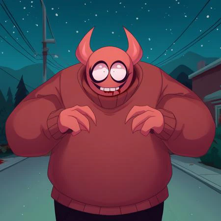 BOBVELSEB, 1boy, solo, colored skin, red skin, horns, sweater, black legwear,
