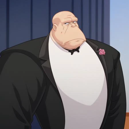 MAX, 1boy, solo, bald, formal, suit, grey pants white gloves black footwear