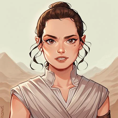 Rey, 1girl, solo, brown hair, brown eyes, sleeveless, jedi, white cloth,
