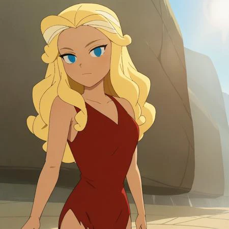 rad_crood, blonde hair, long hair, blue eyes, red dress