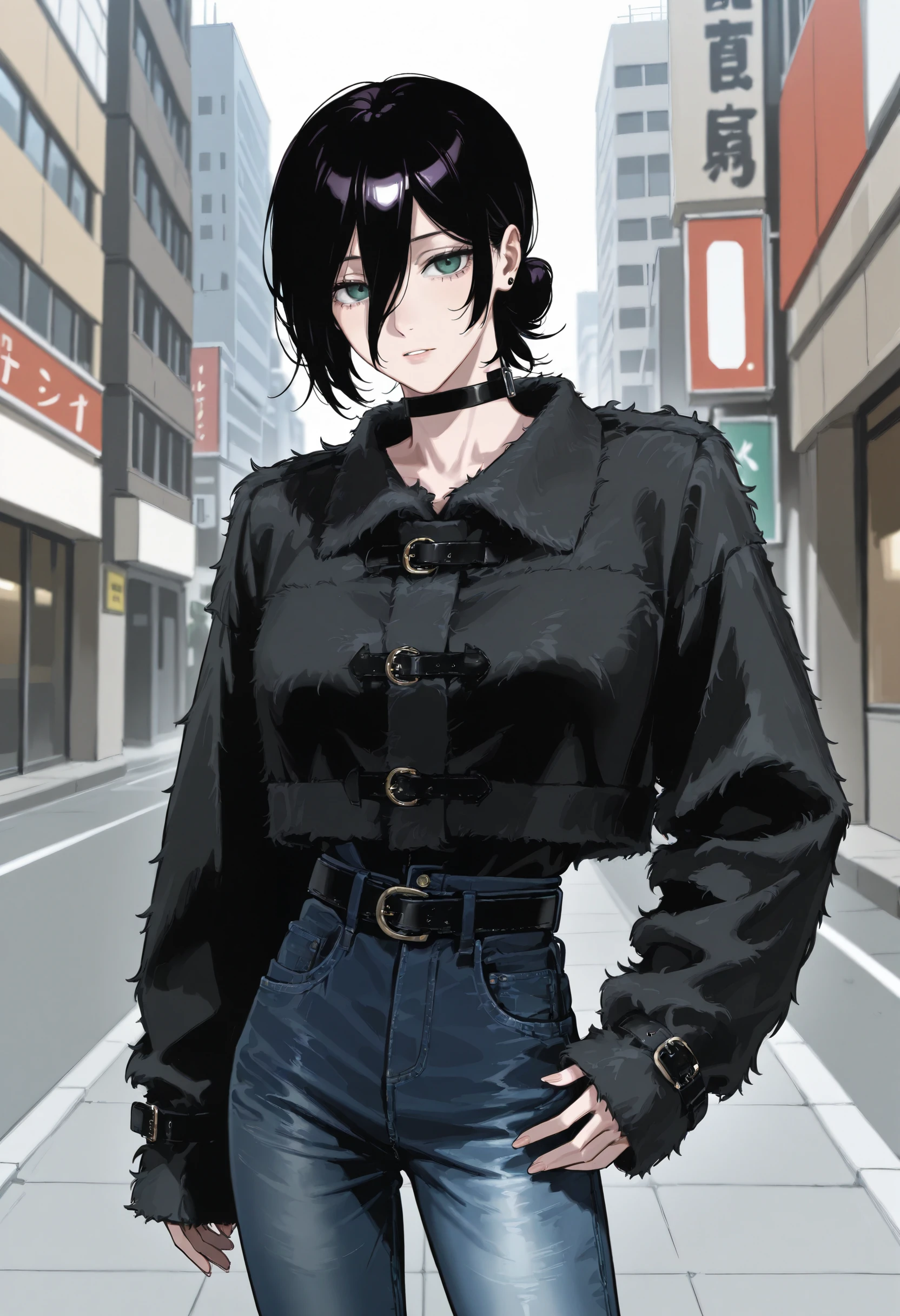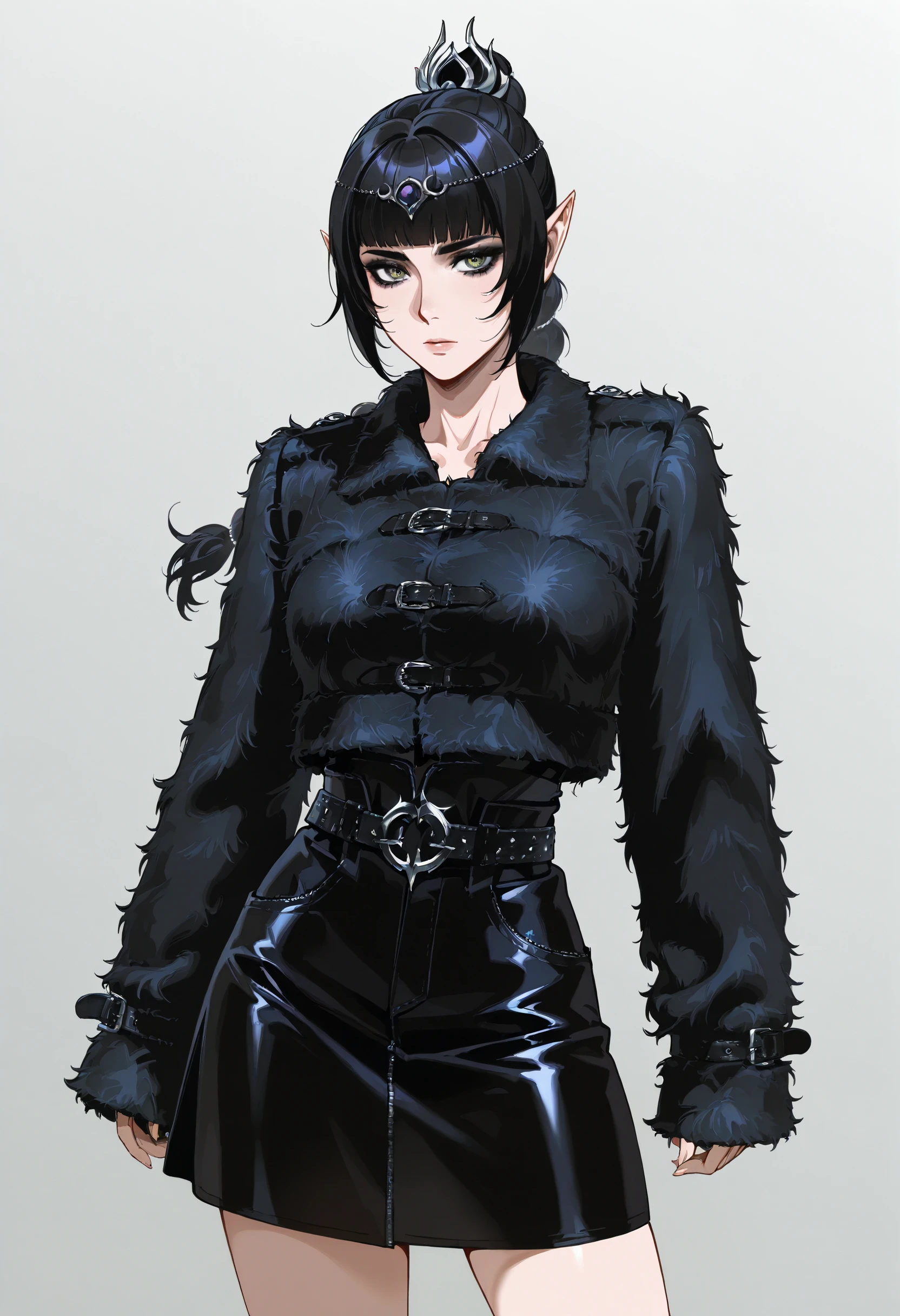 black fur coat, belt, long sleeves, sleeves past wrists,