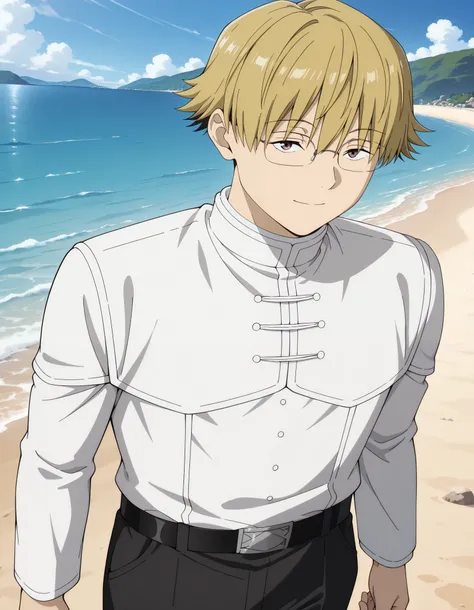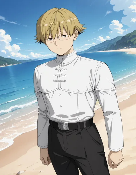 land, glasses, brown eyes, short hair, two-tone hair, blonde hair, black hair, shirt, long sleeves, belt, black pants