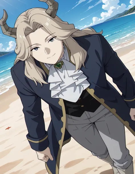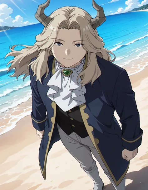lugner, blue eyes, horns, blonde hair, long hair, brooch, white ascot, coat, long sleeves, shirt, pants, boots