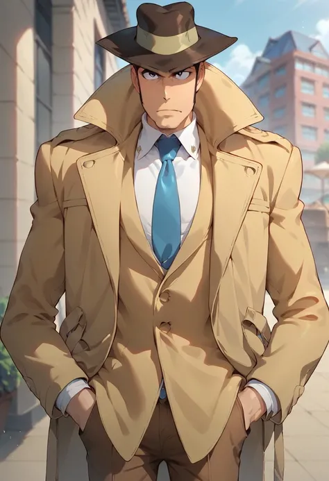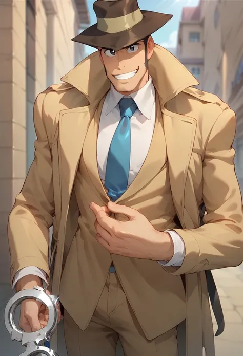 Zenigata, solo, black eyes, sideburns, double chin, hat, blue necktie, trench coat, brown pants,