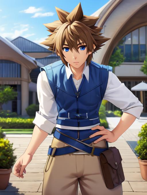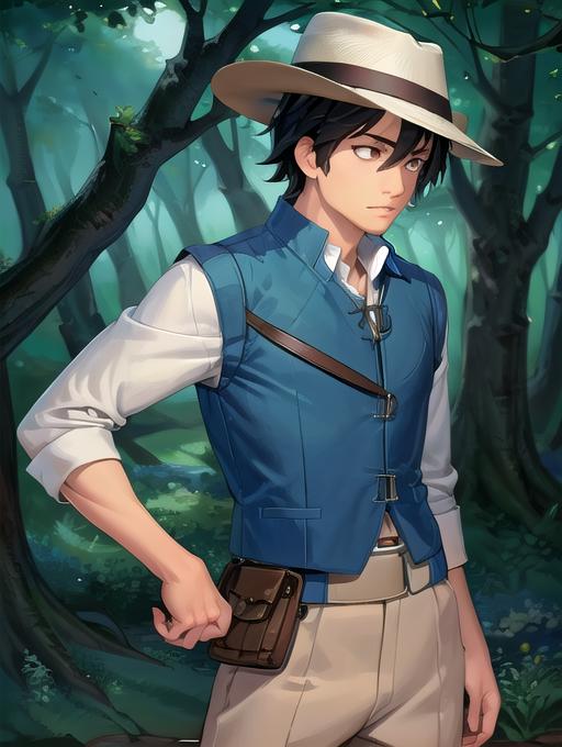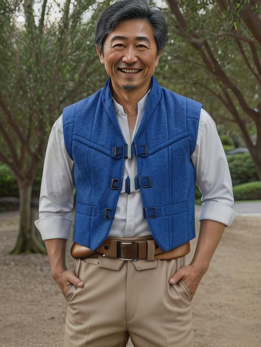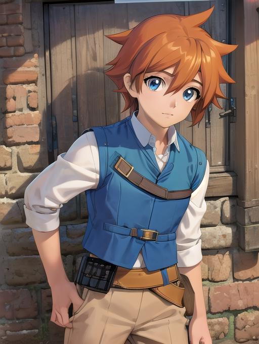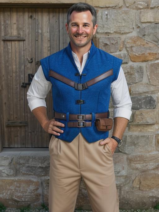 Additional words that may help: blue vest, utility belt, beige pants, white shirt