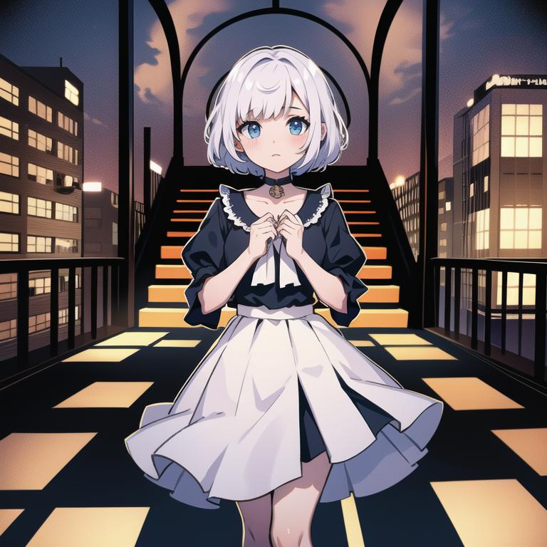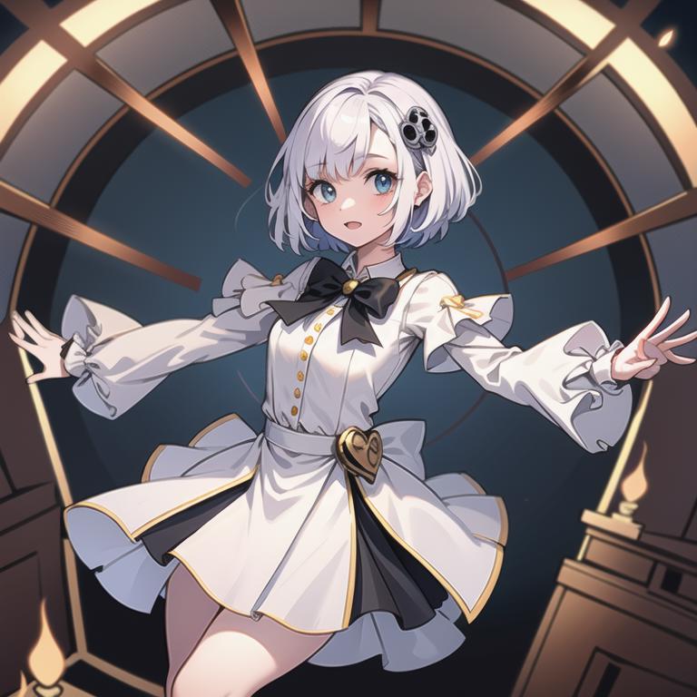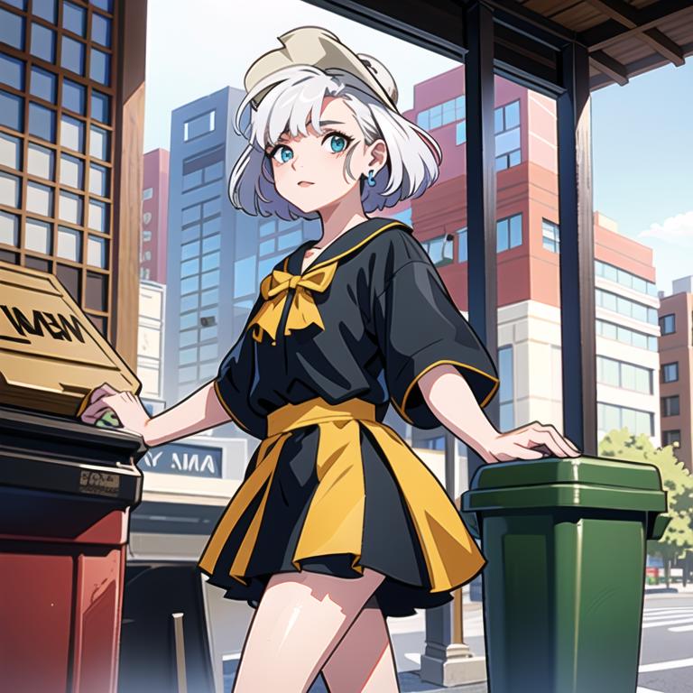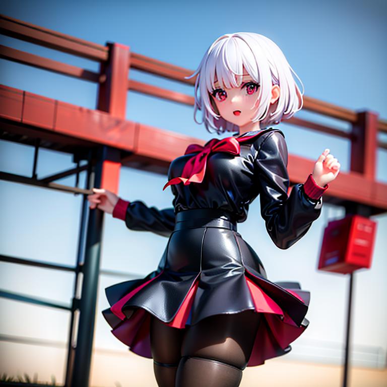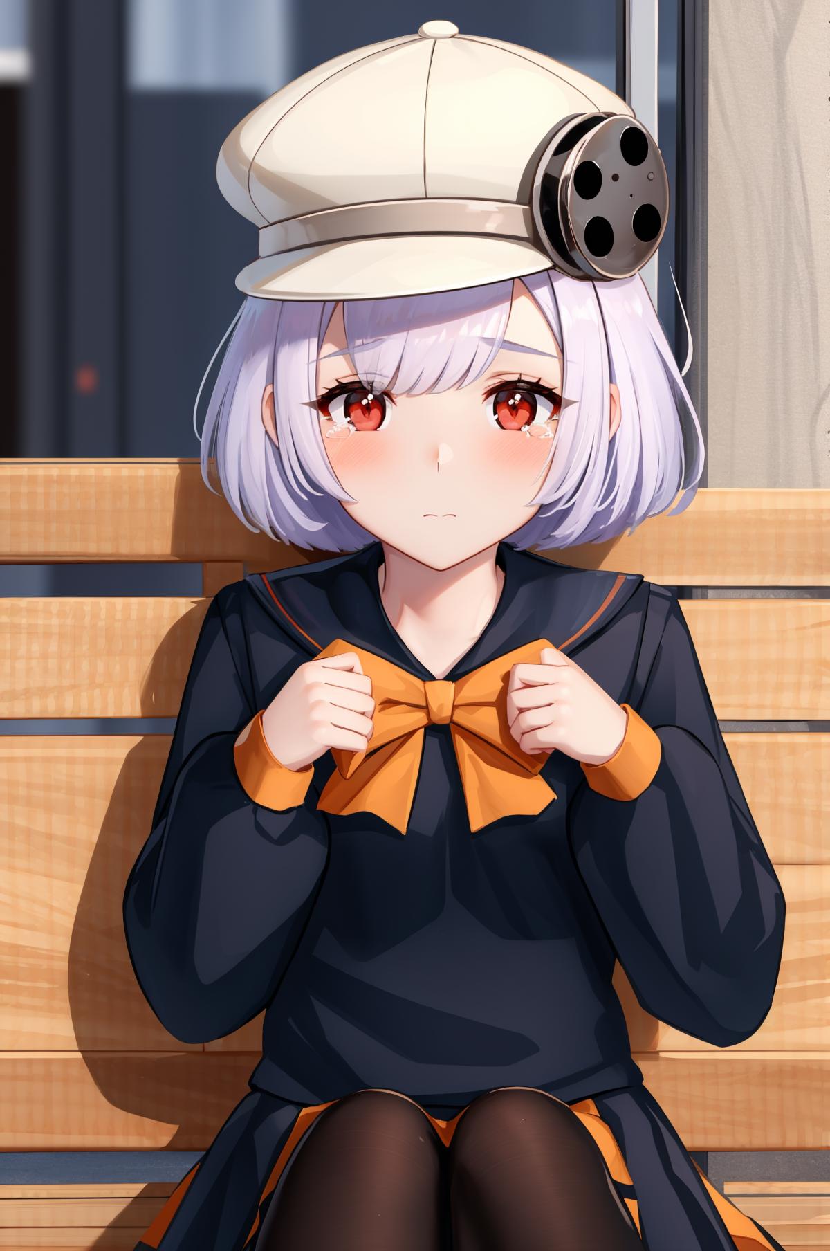 hikaripq2, school uniform, red eyes, short hair, white hair, pantyhose, cabbie hat
