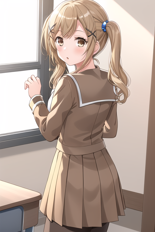 ichigaya arisa, brown eyes,blonde hair,x hair ornament,twintails, (((hanasakigawa school uniform))),sailor collar ,((brown shirt,brown skirt)),black pantyhose
