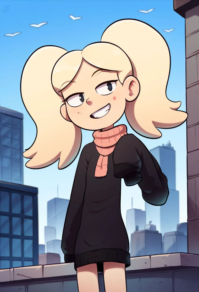 marra, fair skin, flat chest, petite body, blonde hair, twintails, black eyes