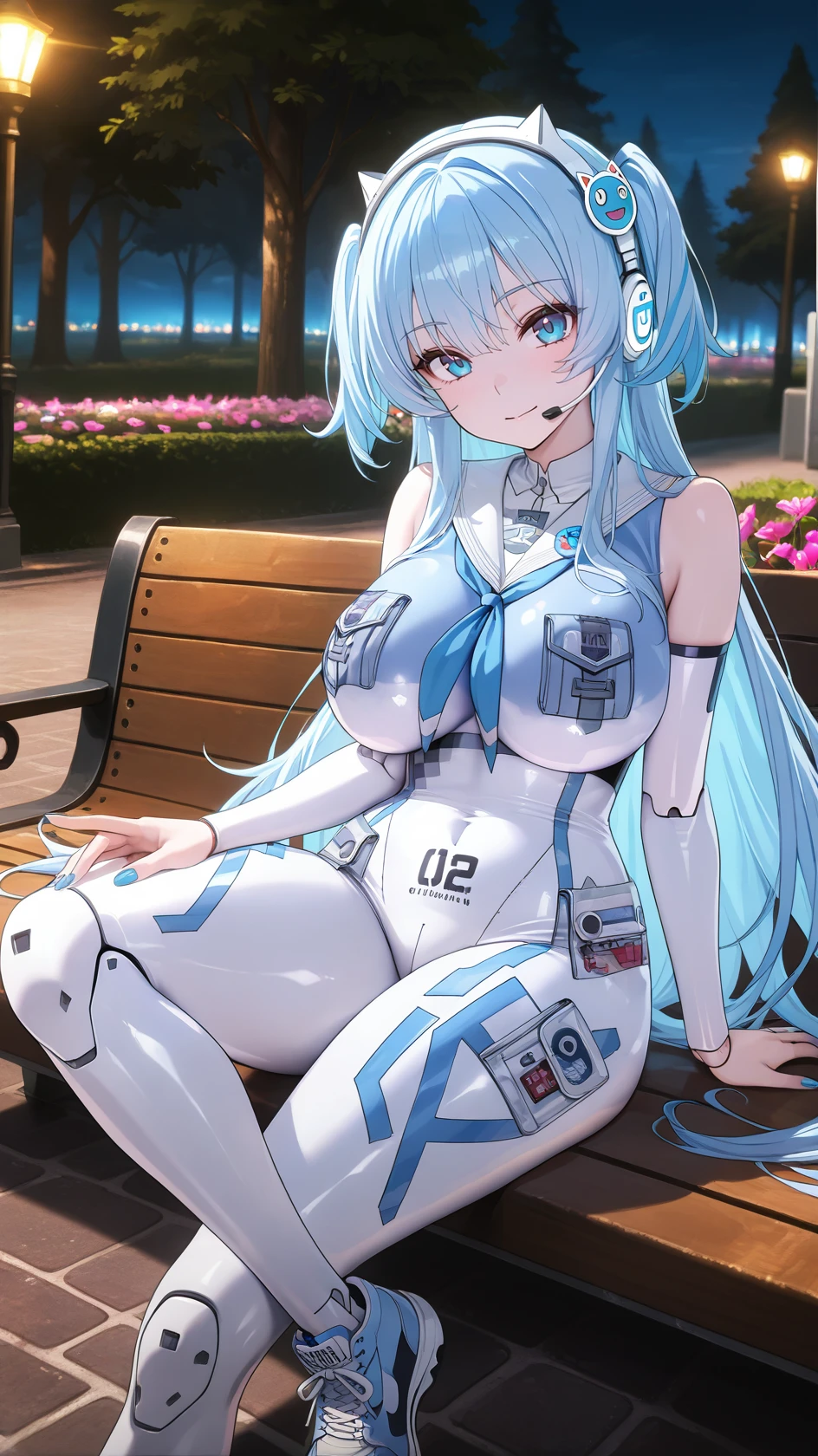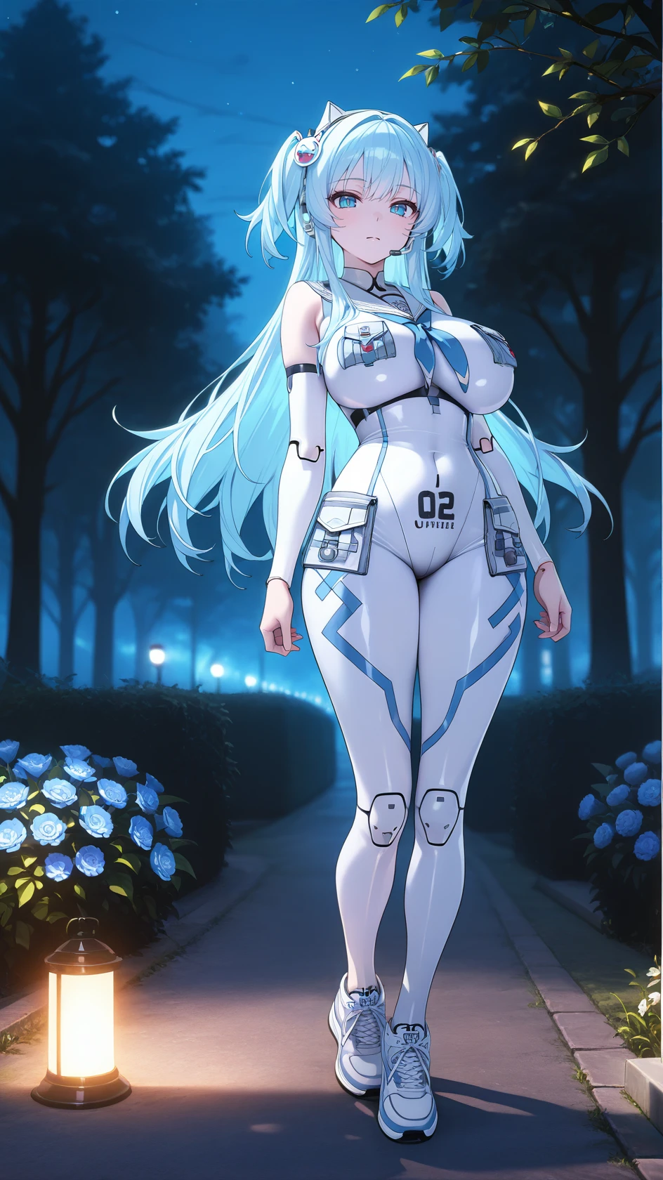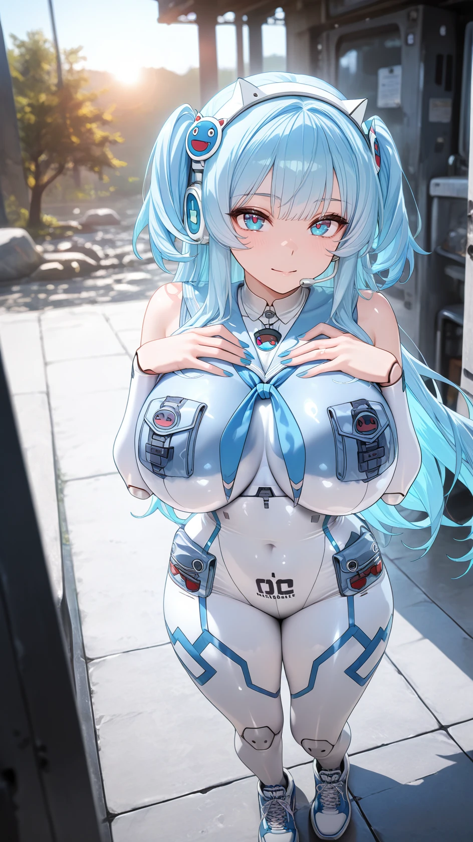 long hair, light blue hair, large breasts, blue eyes, two side up, joints, headset, detached sleeves, bare shoulders, , white , pockets, neckerchief, impossible shirt, blue shirt, shirt, white , sneakers,