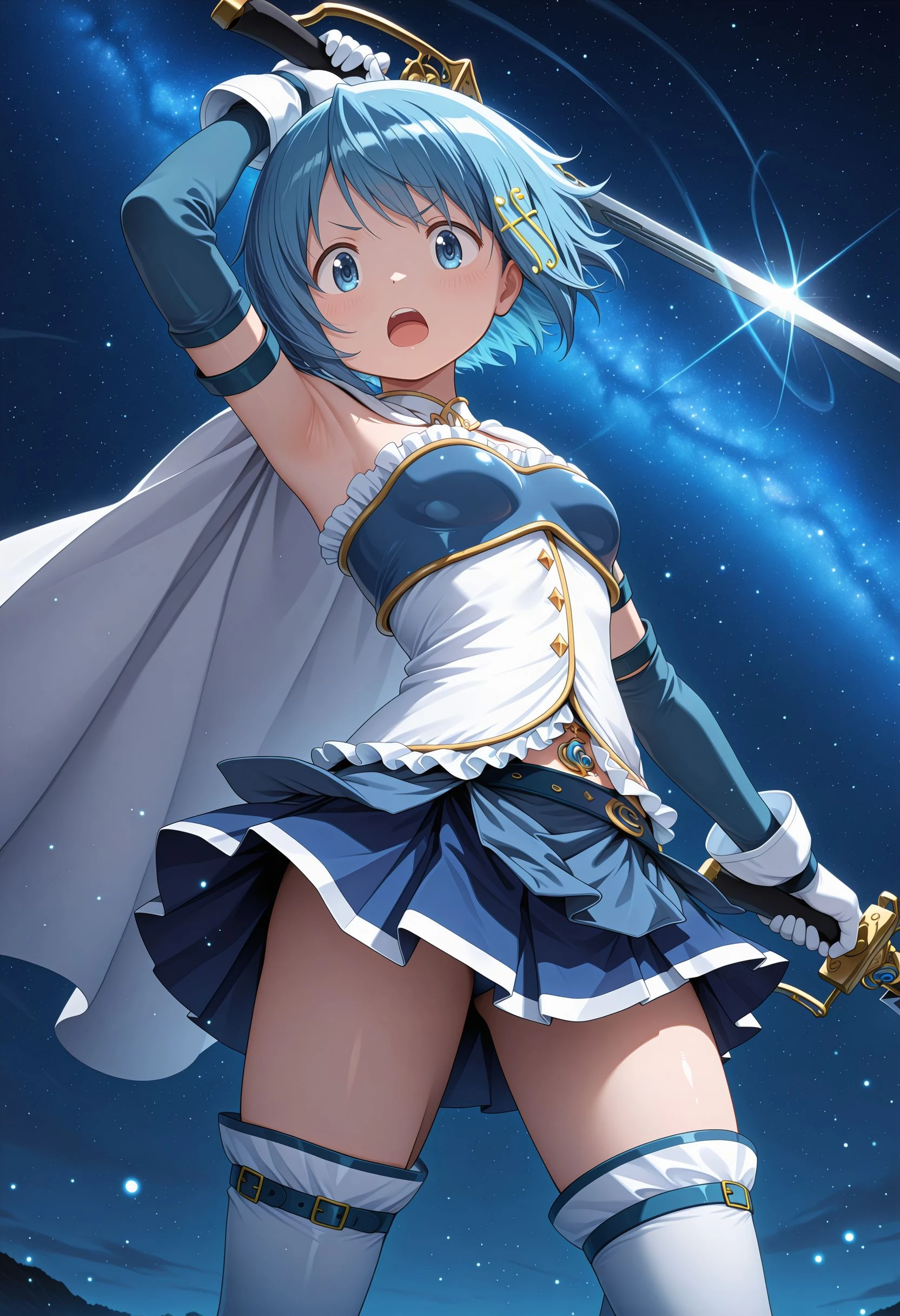 Puella Magi : 1girl, short hair, blue hair, blue eyes, hairclip, musical note hair ornament, white cape, armband, belt, skirt, white gloves, thighhighs, zettai ryouiki, magical girl, soul gem,