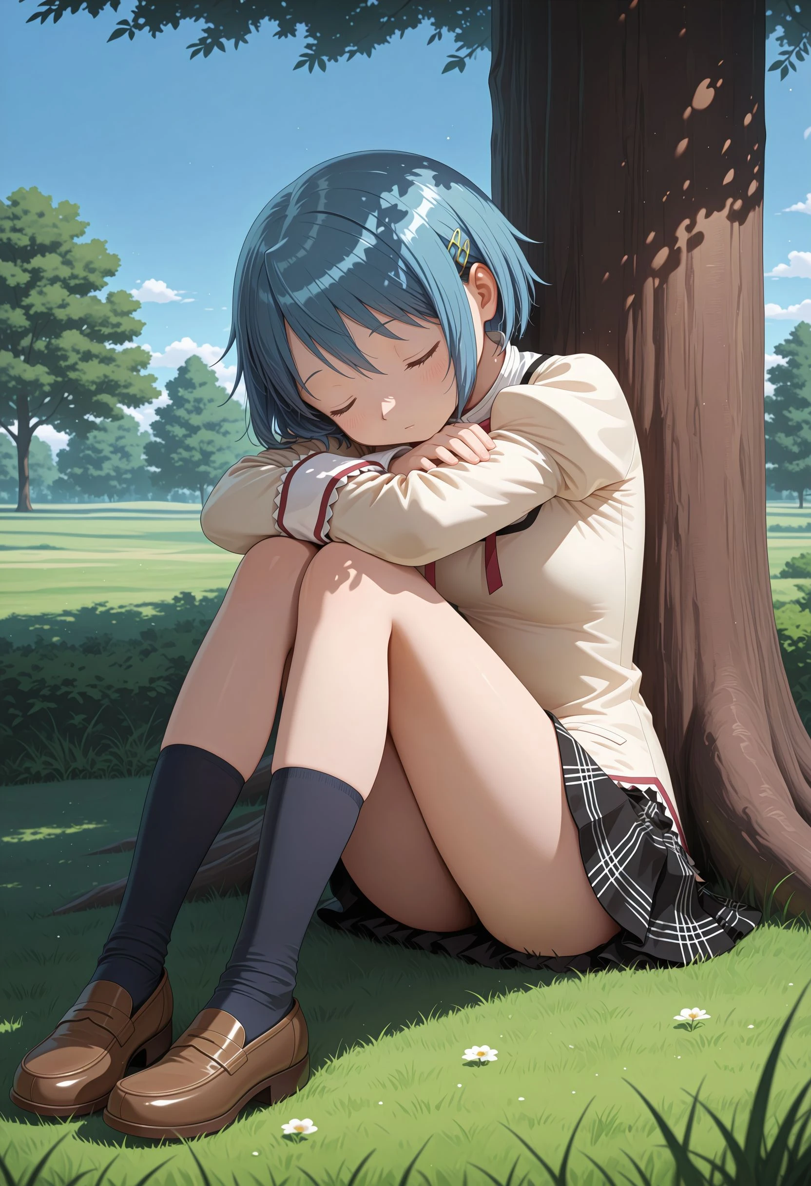 Mitakihara uniform: 1girl, short hair, blue hair, blue eyes, hairclip, mitakihara school uniform, skirt, black socks,