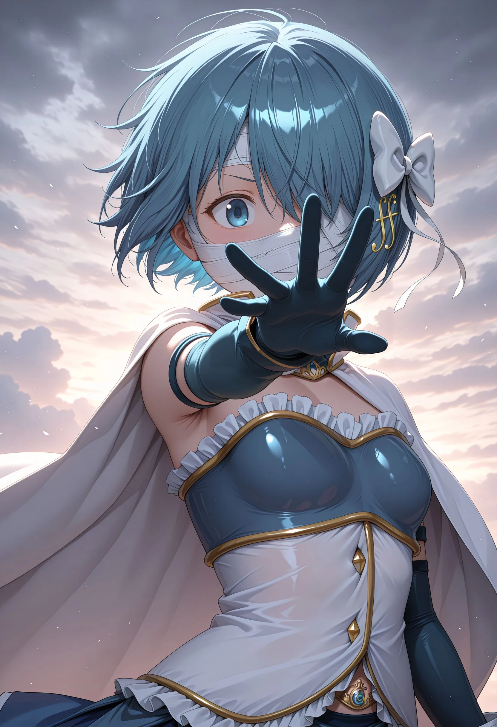 Walpurgis Movie : 1girl, solo, short hair, blue hair, blue eyes, hair bow, hairclip, musical note hair ornament, white bow, one eye covered, bandaged eyes, bandaged head, covered mouth, magical girl,, black gloves, elbow gloves, white gloves, blue gloves, frills, frilled shirt, blue skirt, white cape, cape, white bandages, zettai ryouiki, soul gem,