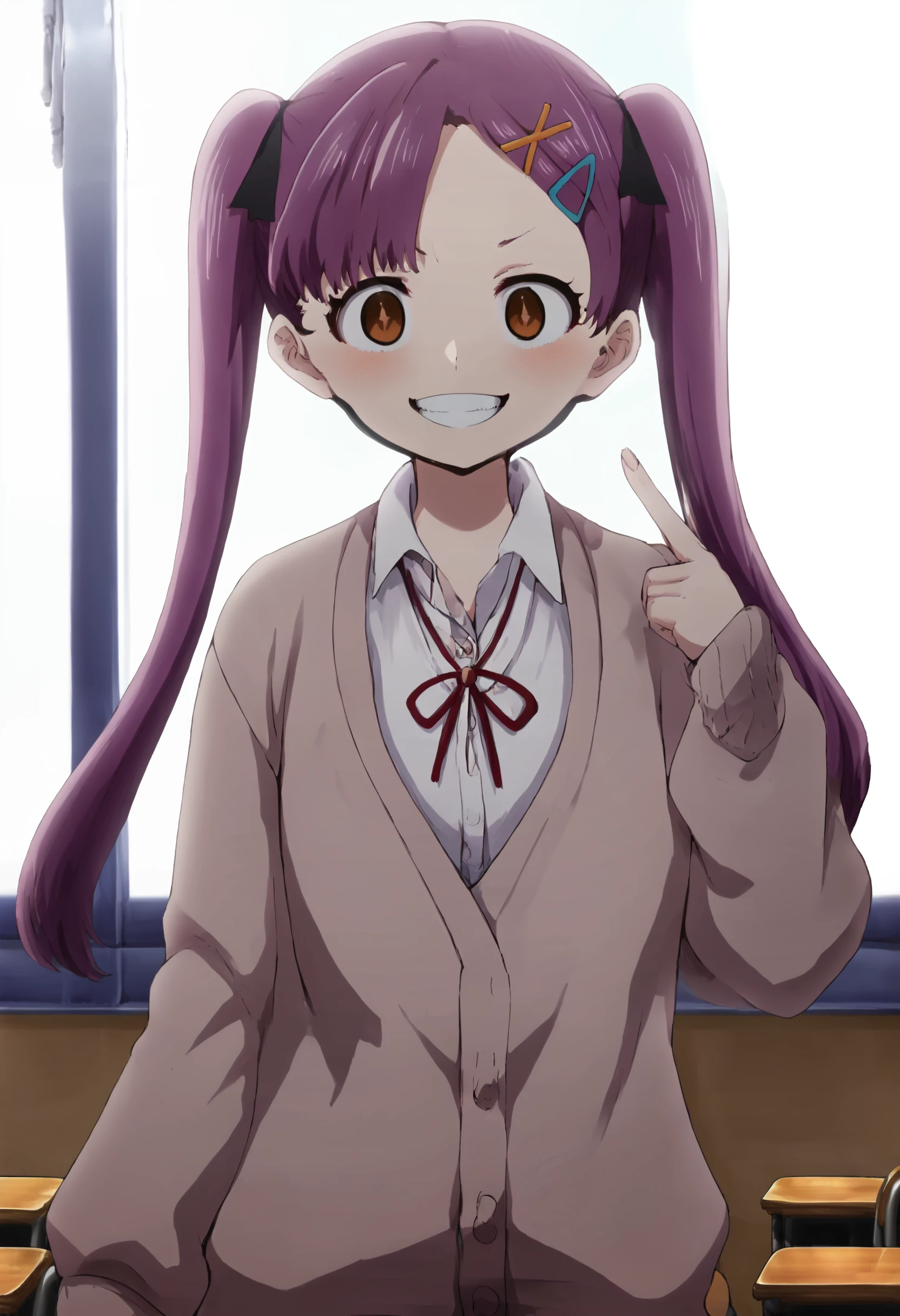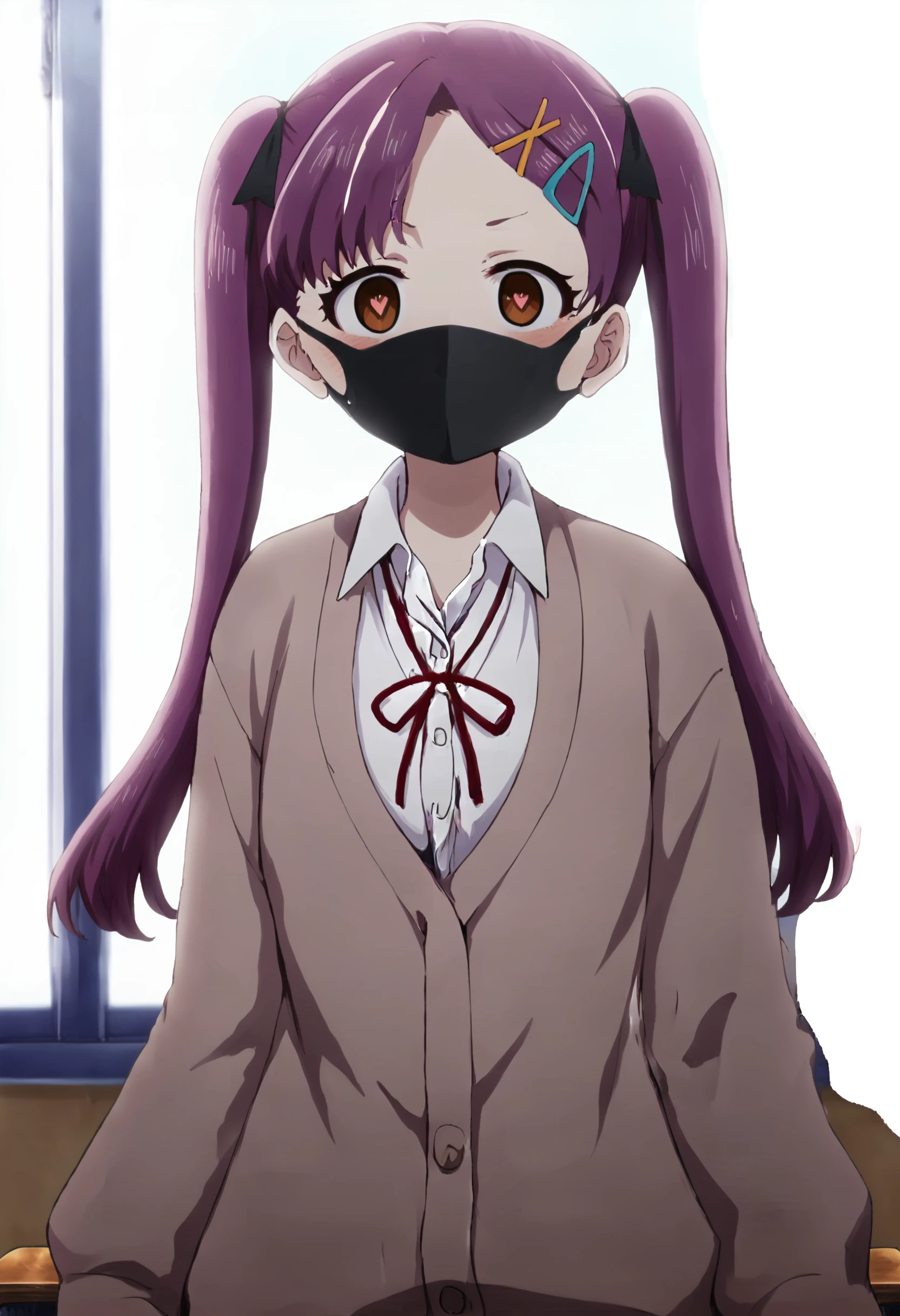 Keywords you’ll almost always want to use: Kanna Andou, twintails, purple hair, X hair ornament, ribbon, brown eyes, black mouth mask, hair ornament,