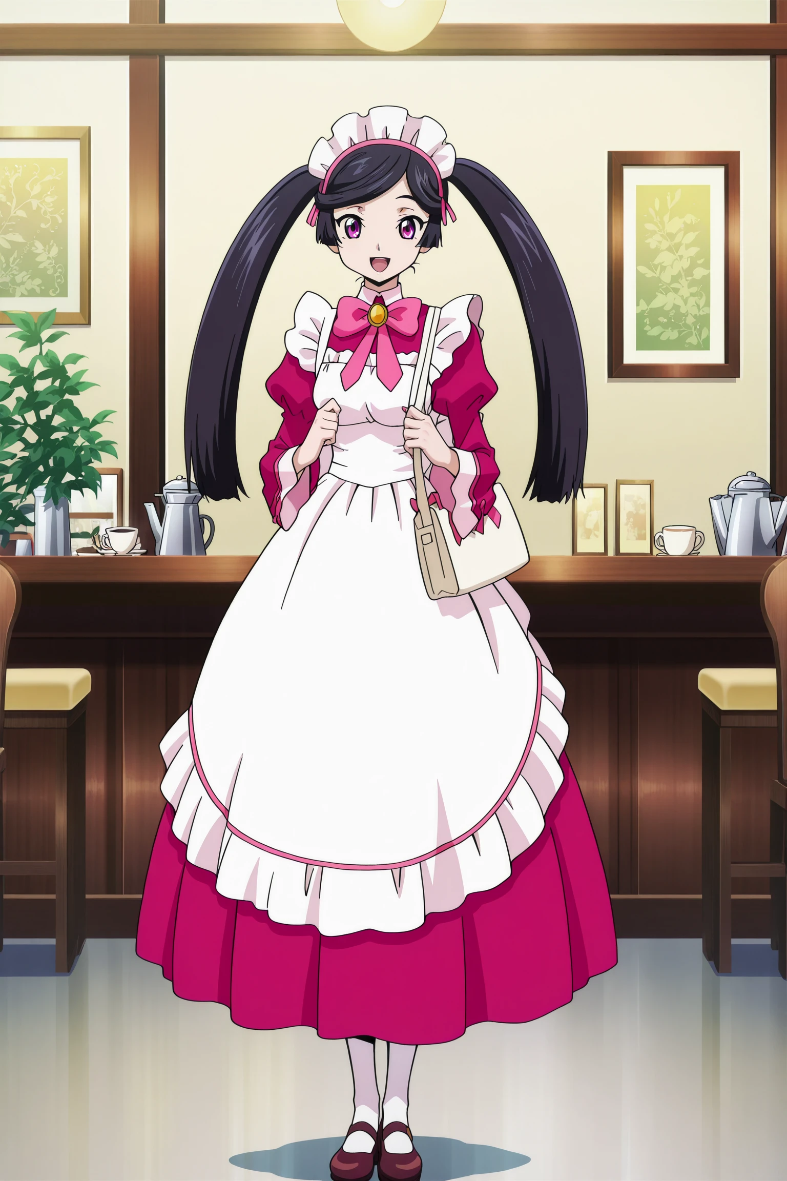 Sakuya Raspberry cafe uniform (outfit), maid, apron, twintails, bow, pink bow, ribbon, dress, shoes, pantyhose, mary janes, maid headdress | bag, handbag