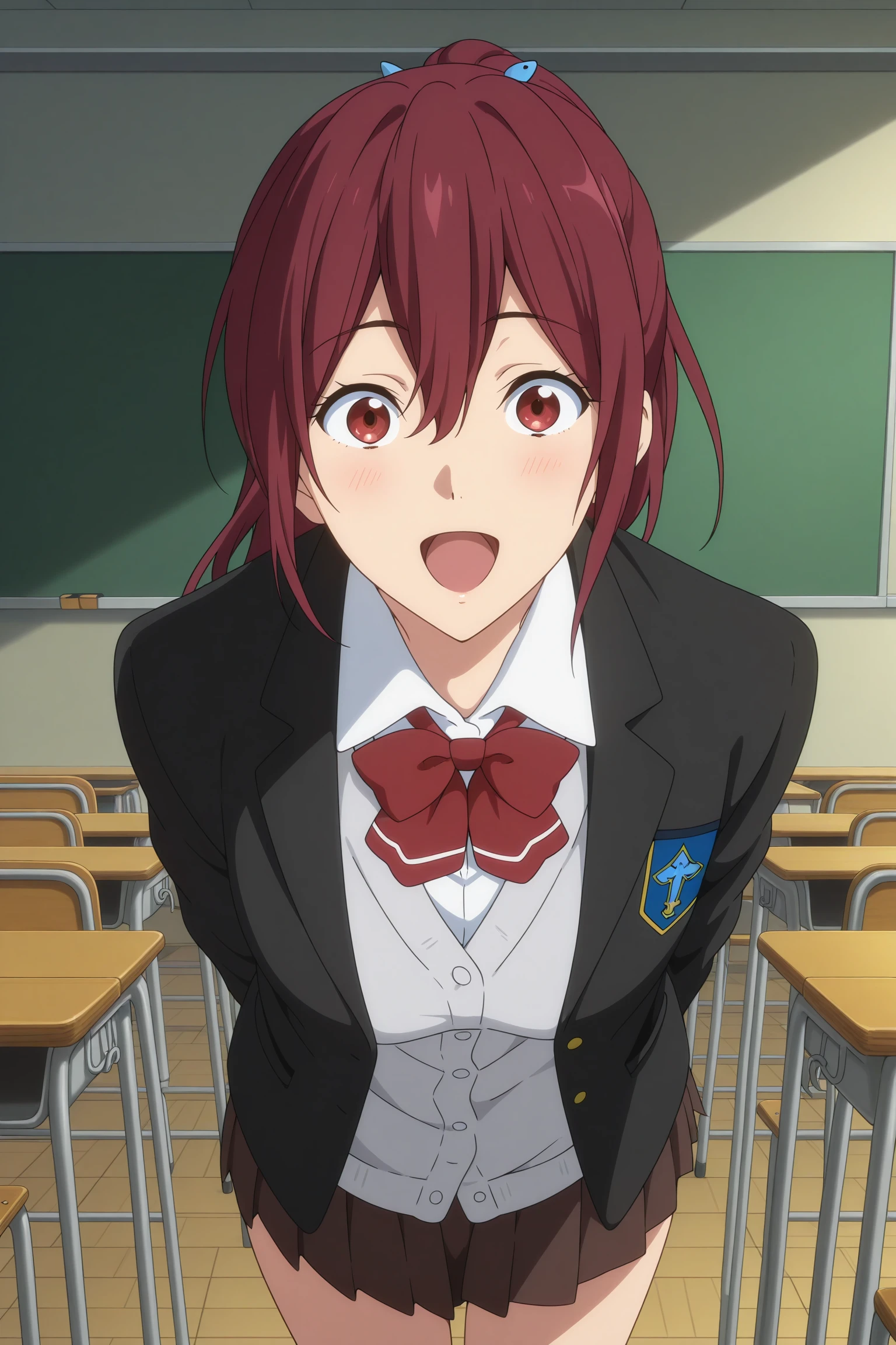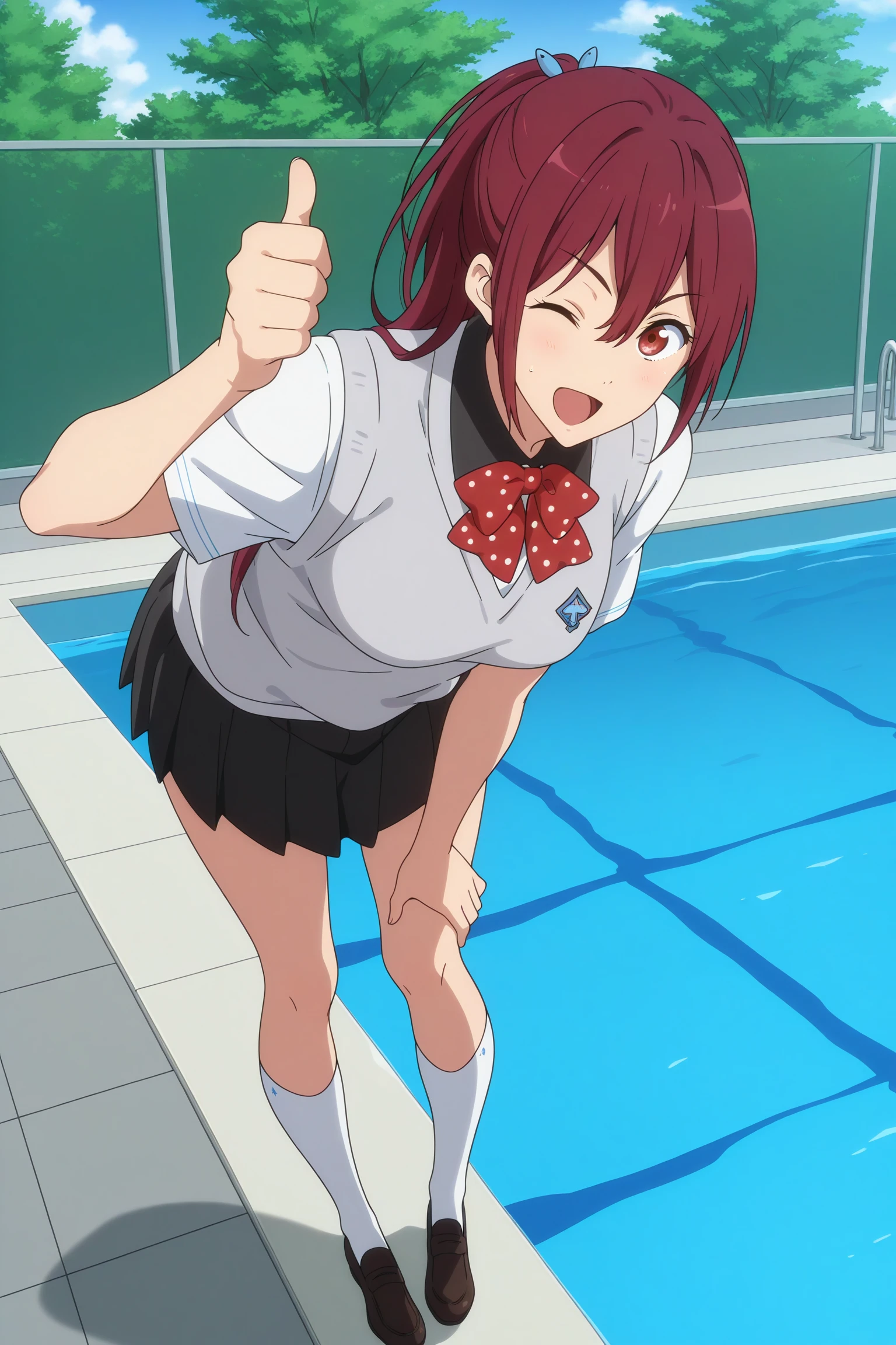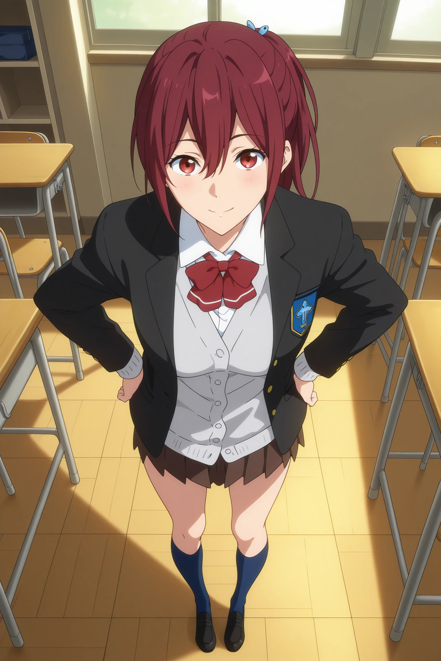 matsuoka gou, long hair, ponytail, red hair, hair between eyes, red eyes, school uniform, long sleeves, black jacket, open jacket, white shirt, collared shirt, red bowtie, grey cardigan, brown skirt, pleated skirt, blue kneehighs, black loafersSchool Uniform (Summer)
