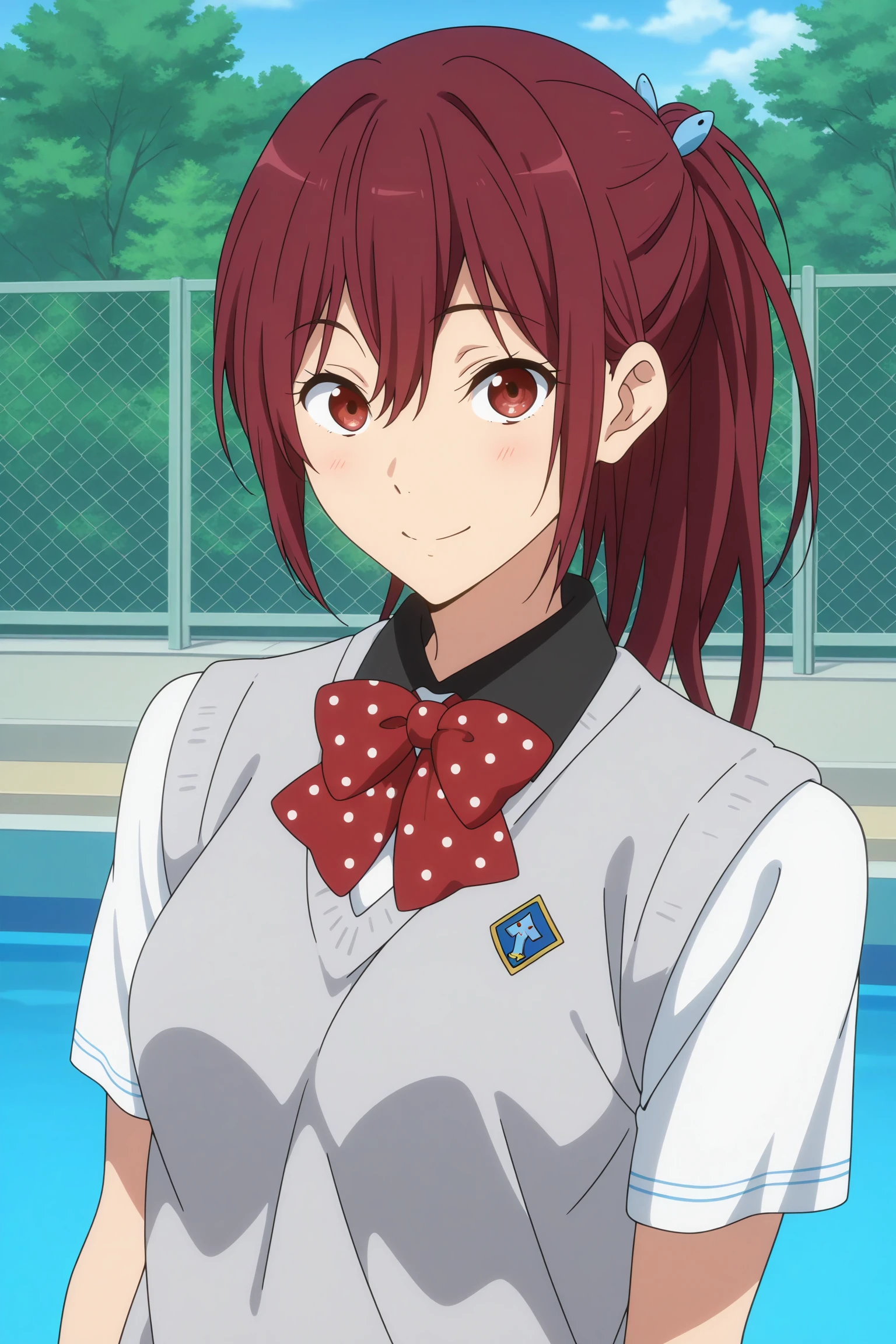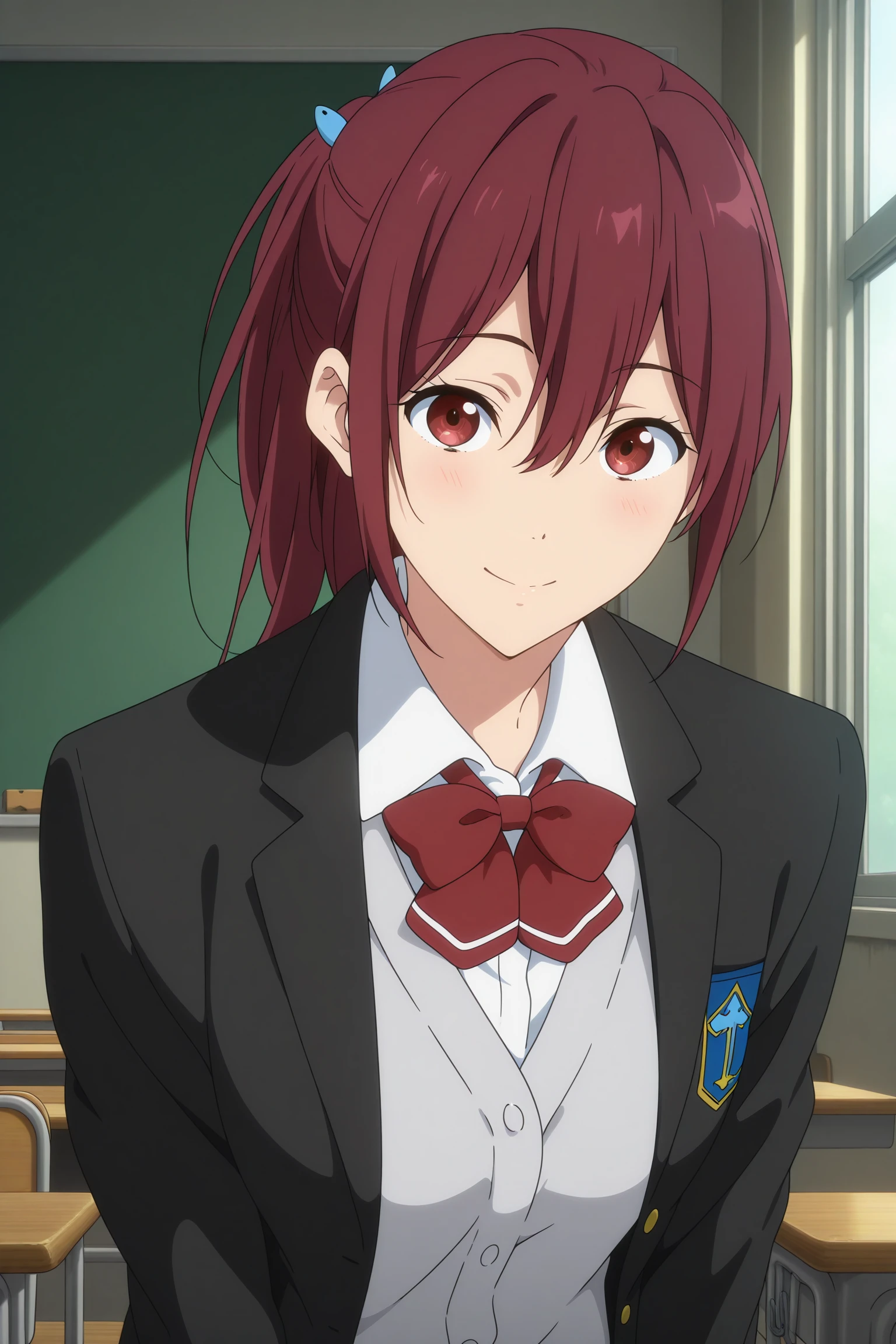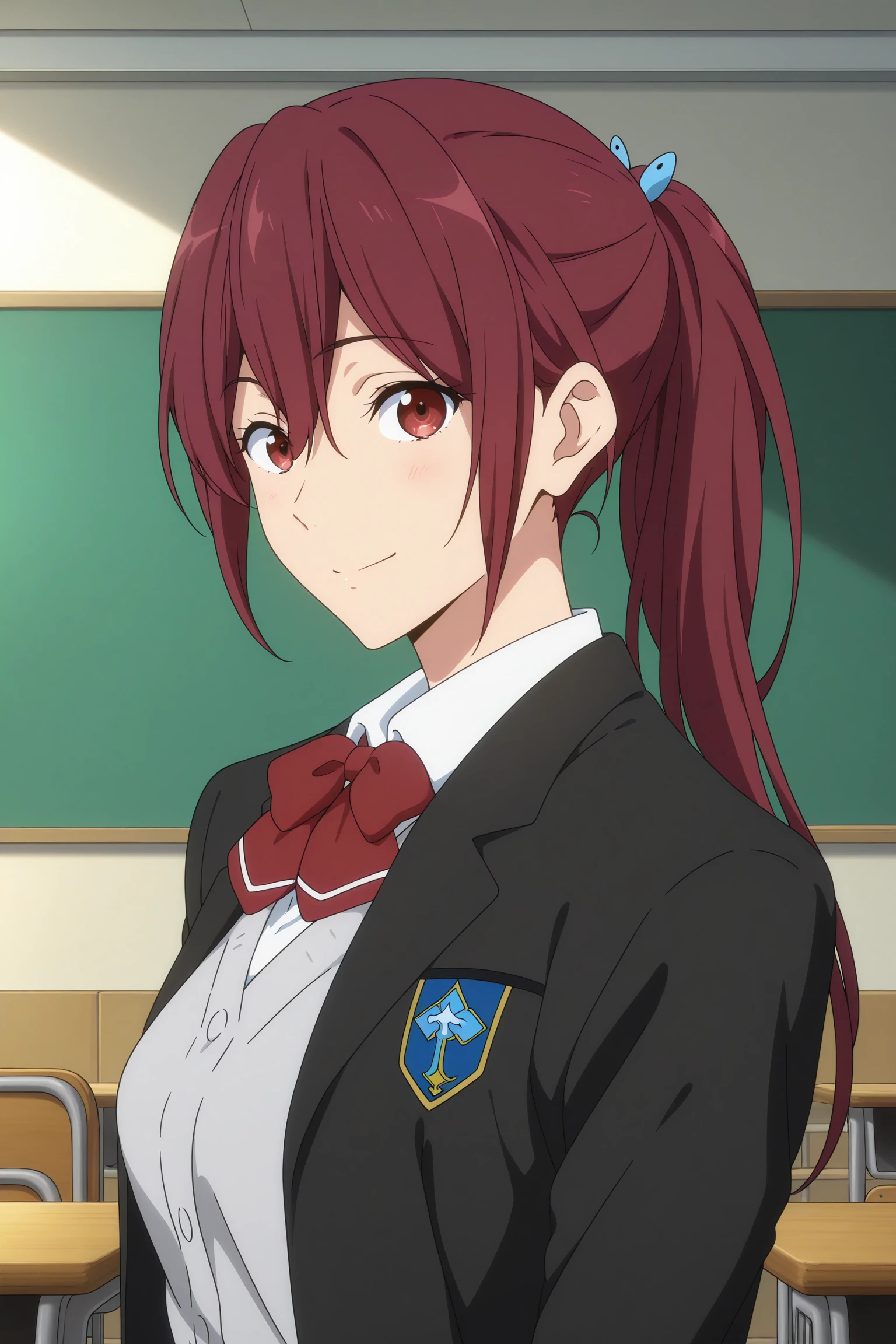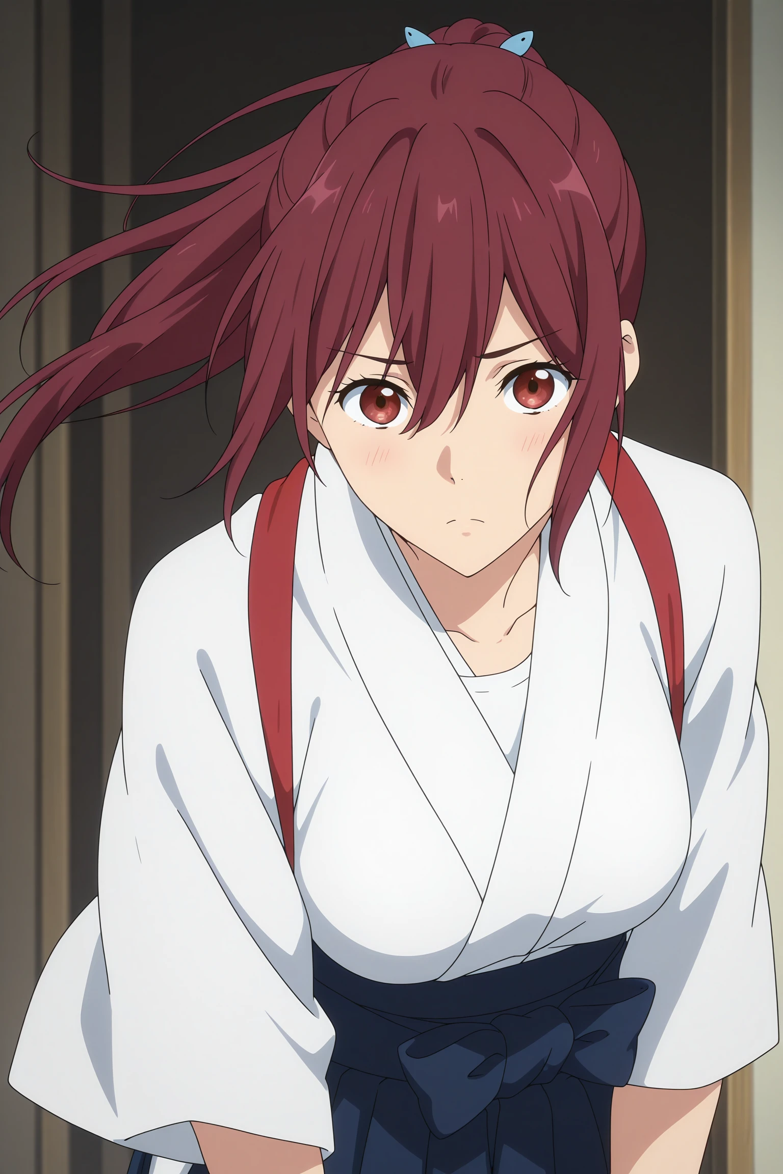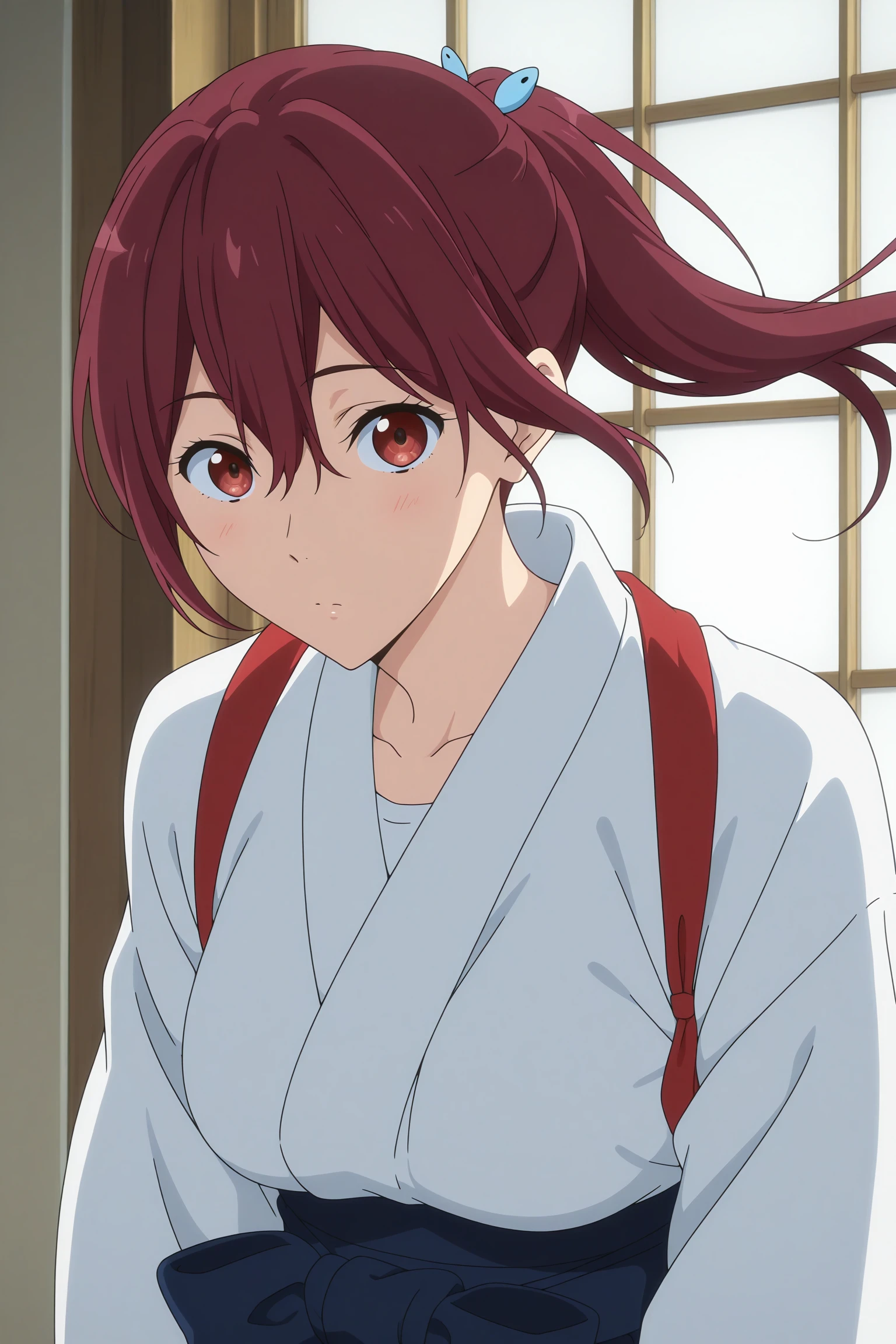 matsuoka gou, long hair, ponytail, blue hair ornament, red hair, hair between eyes, red eyes,