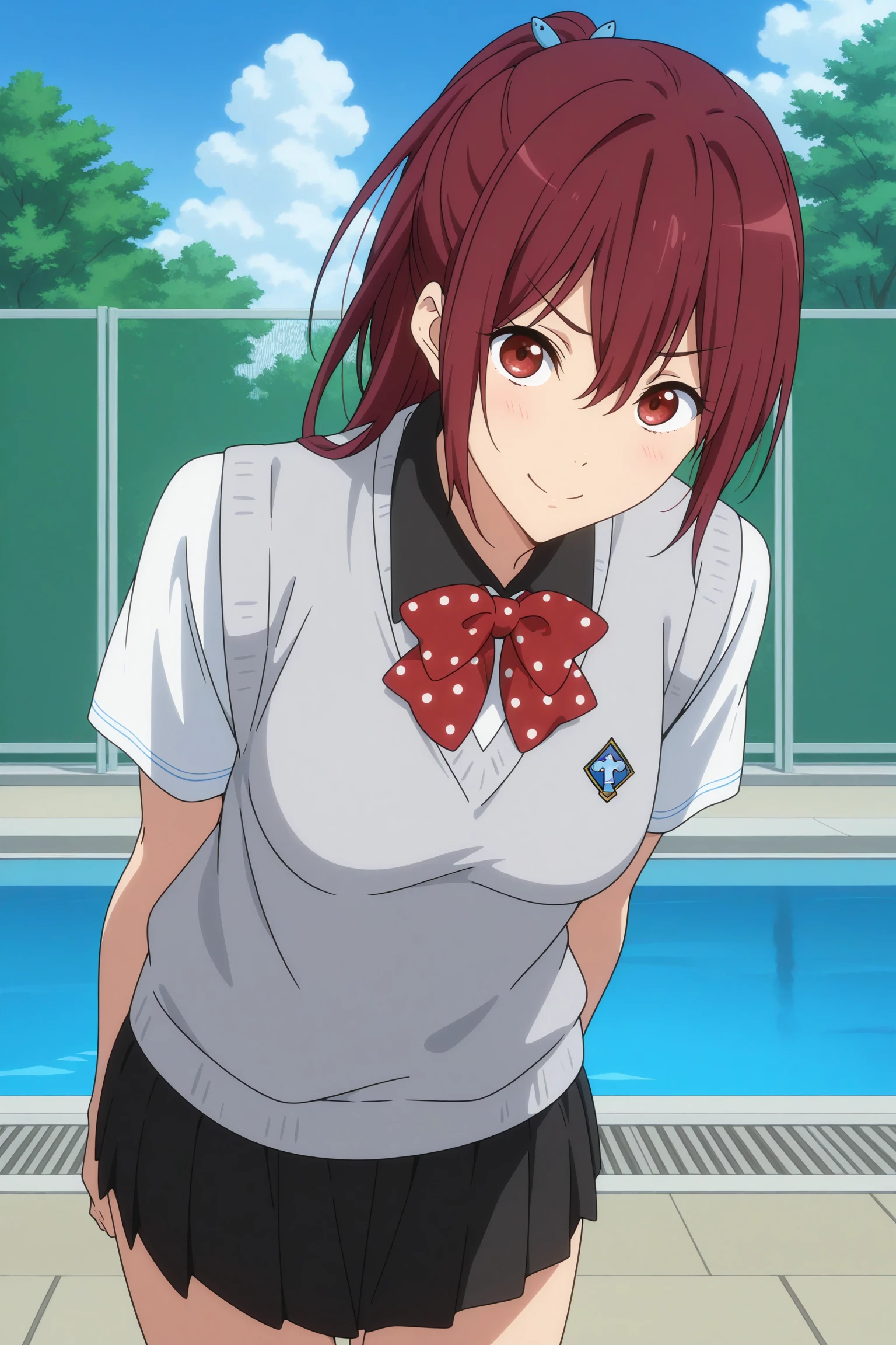matsuoka gou, long hair, ponytail, red hair, hair between eyes, red eyes, school uniform, white shirt, short sleeves, blue striped sleeve ends, colloared shirt, red-white polka dot bowtie, grey sweater vest, black skirt, pleated skirt, white kneehighs, black loafersHakama