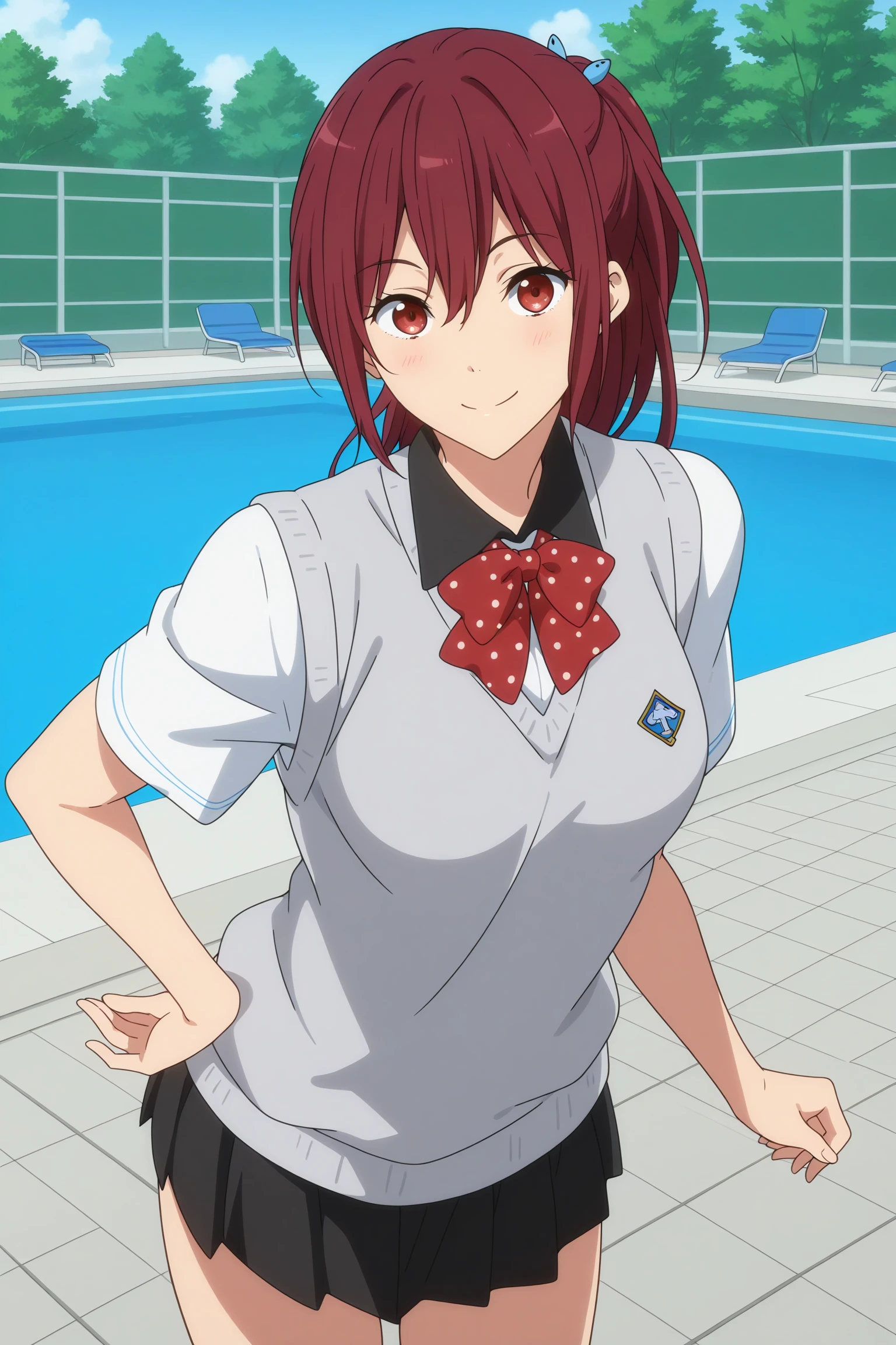 school uniform, white shirt, short sleeves, blue striped sleeve ends, colloared shirt, red-white polka dot bowtie, grey sweater vest, black skirt, pleated skirt, white kneehighs, black loafers