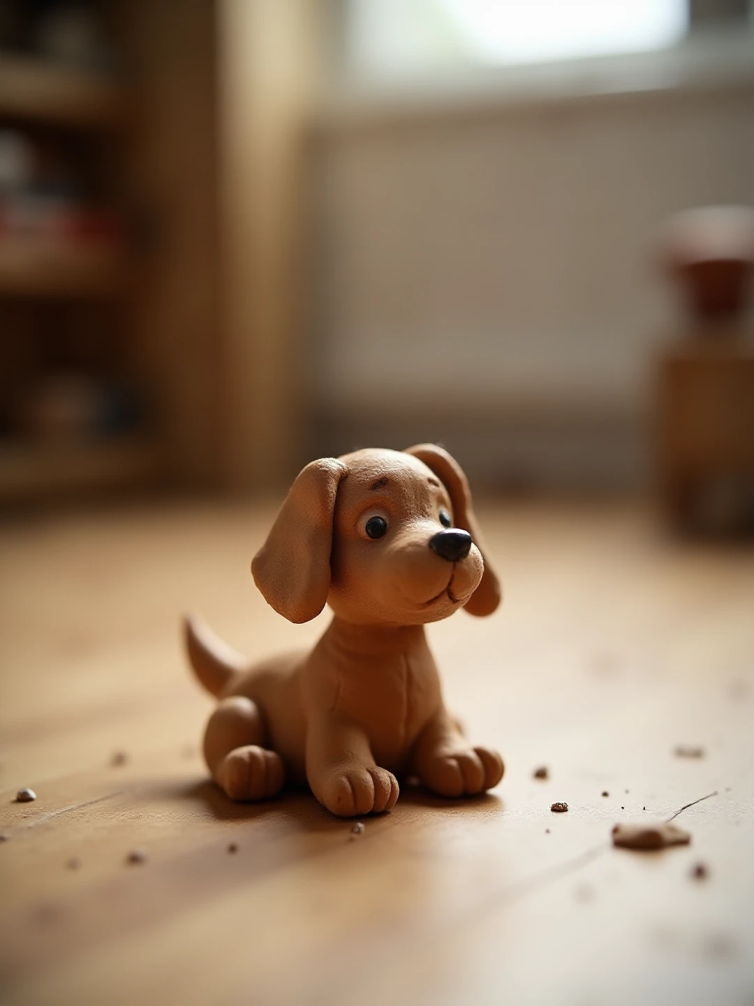 (a clay dog toy on the floor,best quality,4k,8k,highres,masterpiece:1.2),ultra-detailed,(realistic,photorealistic,photo-realistic:1.37),clay material,small and cute,playful expression,smooth surface,soft lighting,indoor setting,minimalist background,shallow depth of field,earthen tones,subtle shadows,gentle highlights,detailed texture,calm atmosphere,handcrafted,artisanal,whimsical charm,cozy room,wooden floor,natural light,soft focus,peaceful scene,relaxed mood,childhood nostalgia,innocent feel,comforting presence