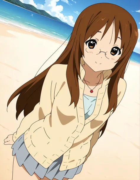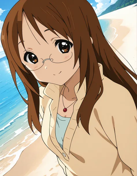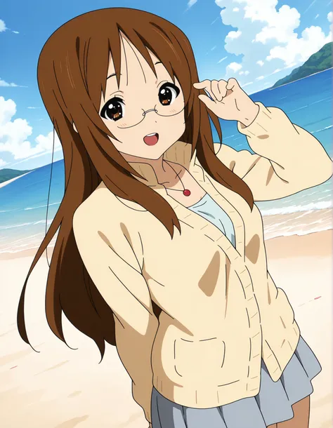 yamanaka sawako, brown eyes, glasses, brown hair, long hair, cardigan, long sleeves, necklace