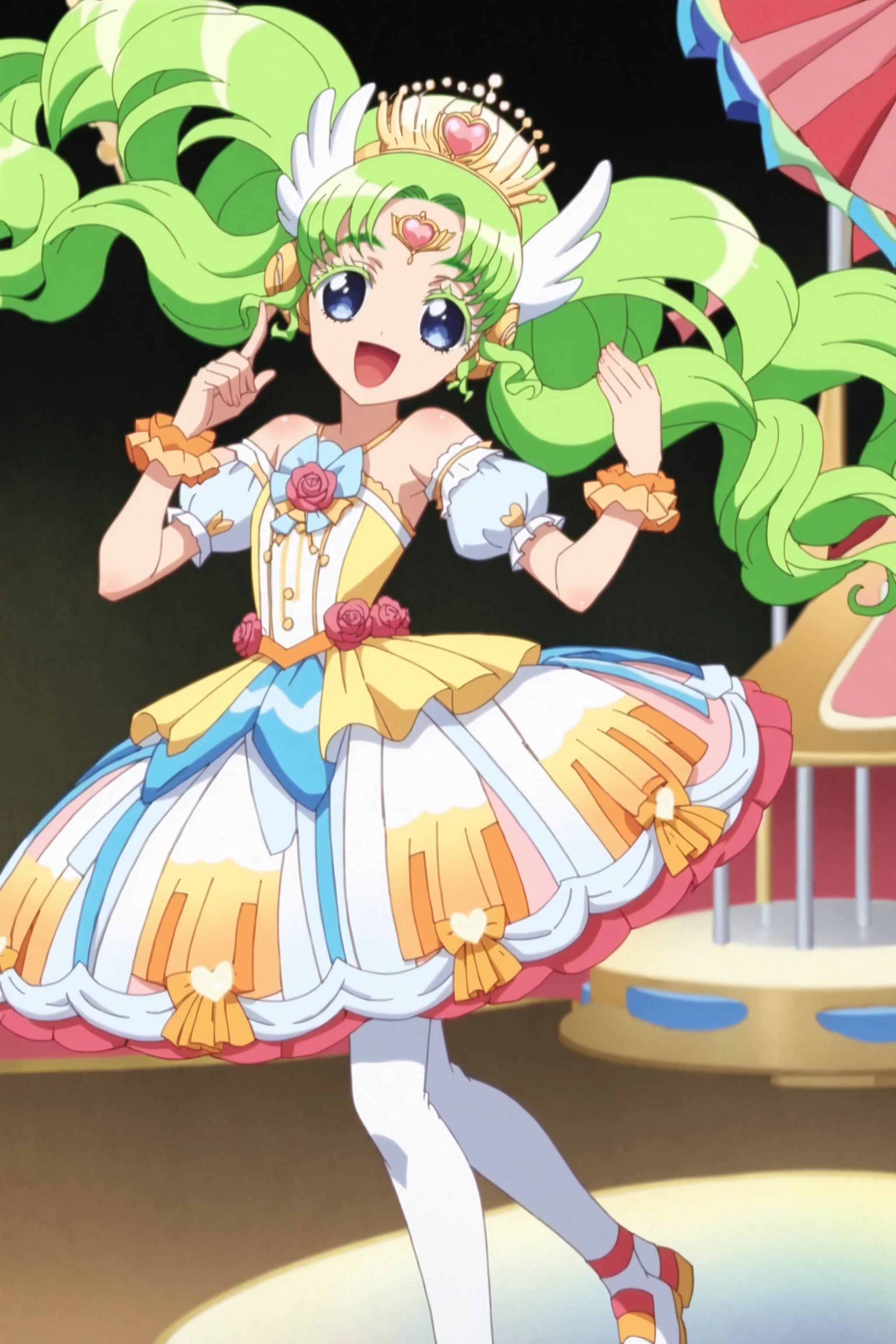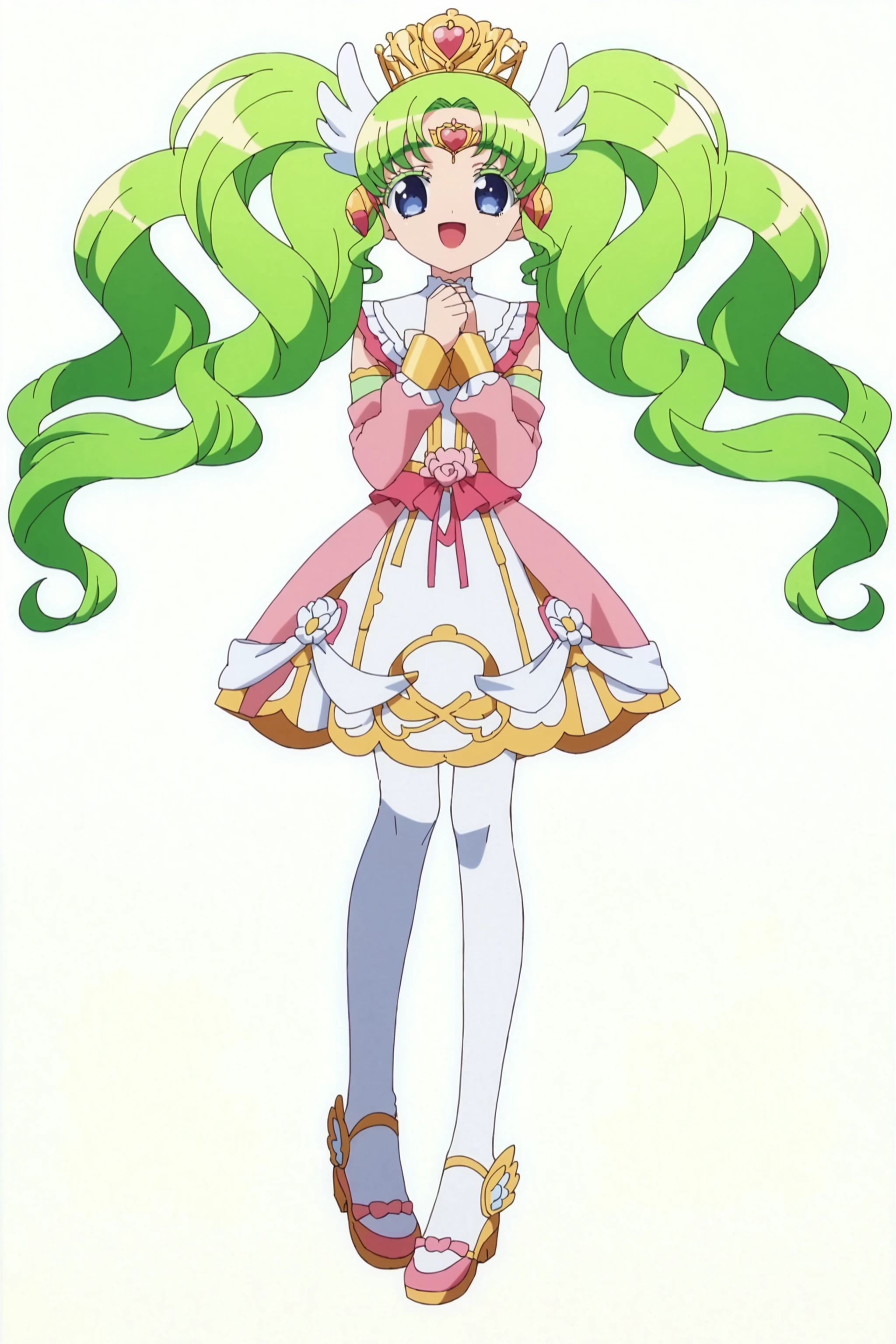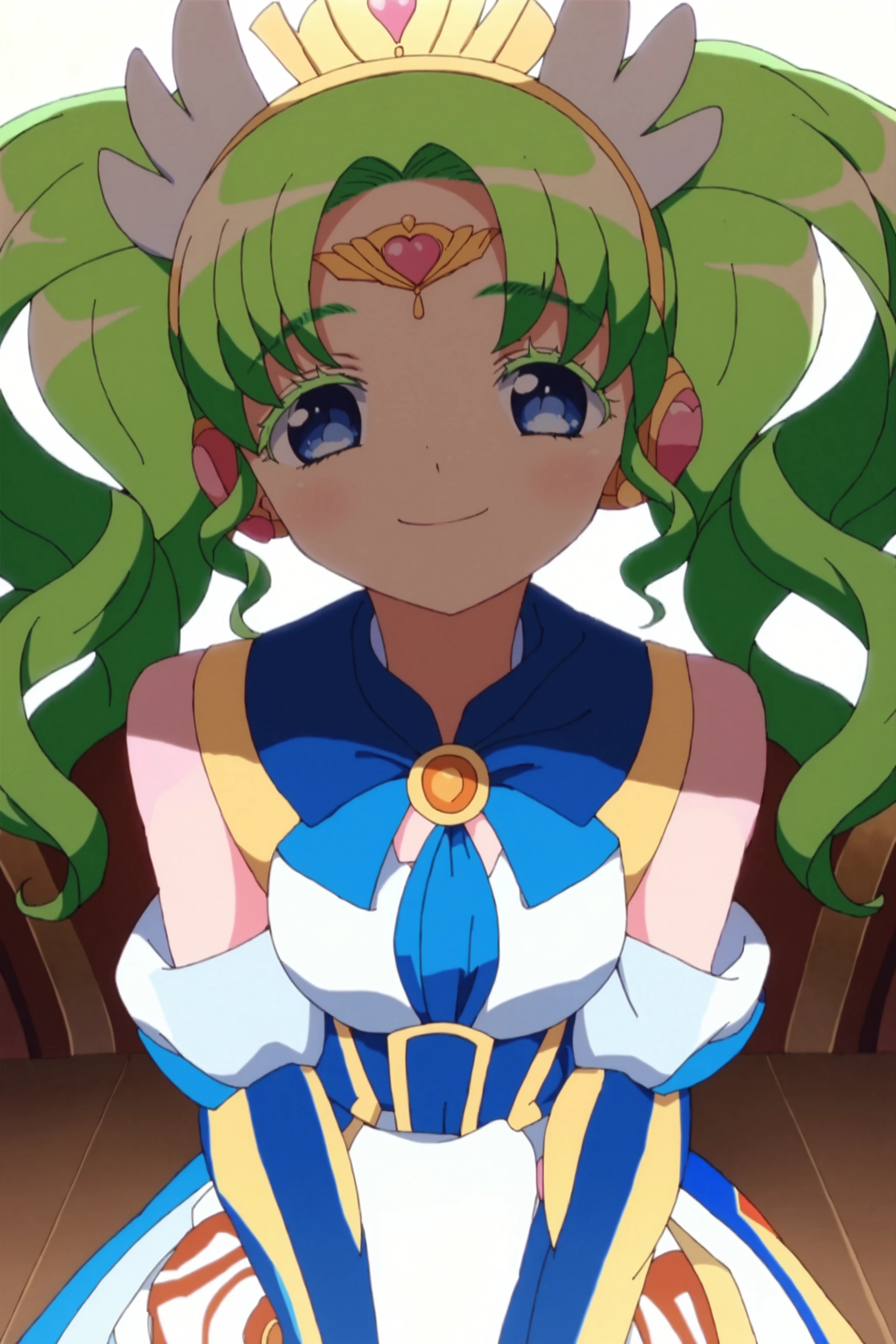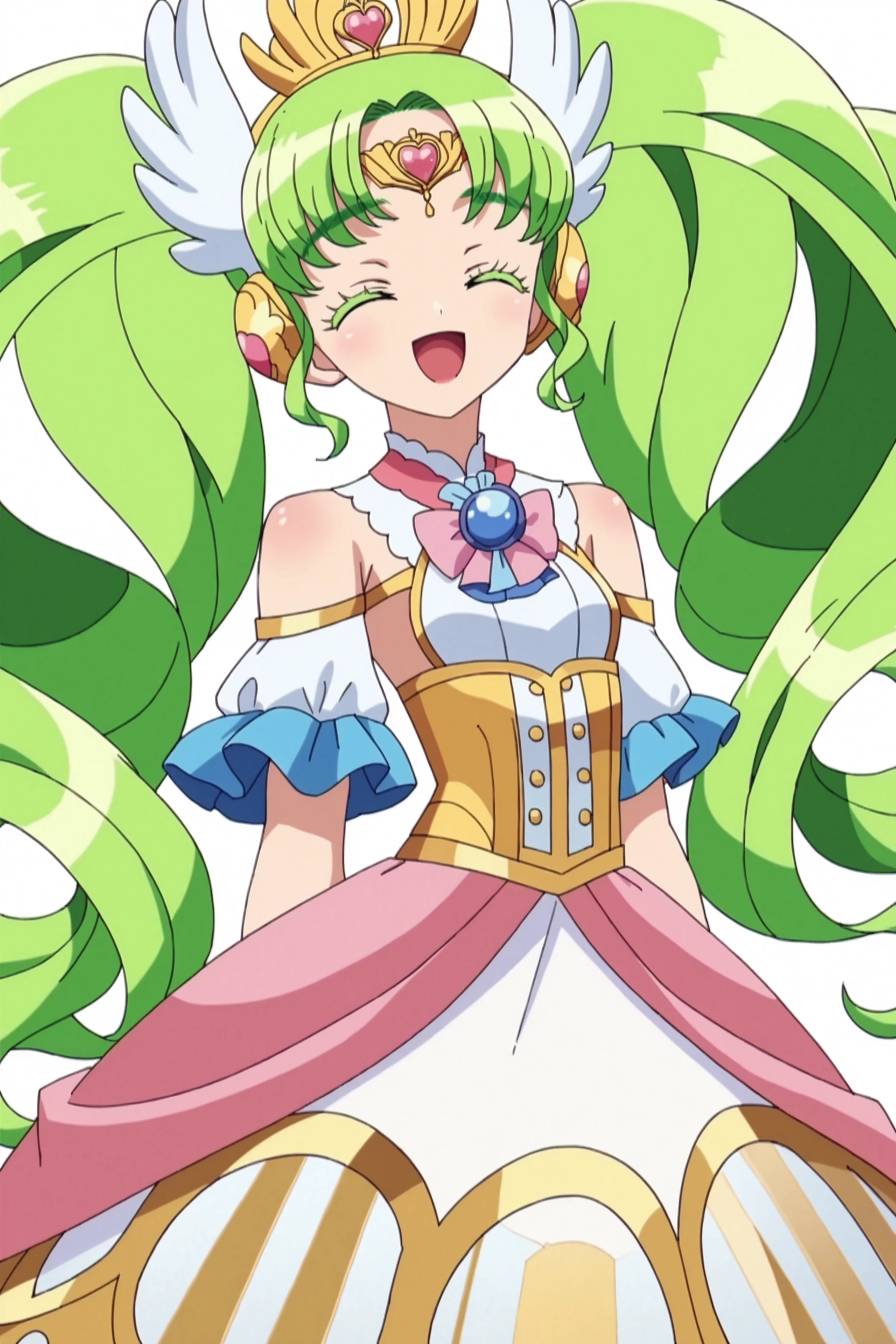long_hair, blue_eyes, twintails, green_hair, head_wings, facial_mark, forehead_jewel, jewelry, colored_eyelashes, heart, tiara