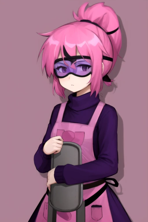 KipOneshot, 1girl, solo, short hair, purple dress, pink hair, pink apron, turtleneck, goggles, folded ponytail