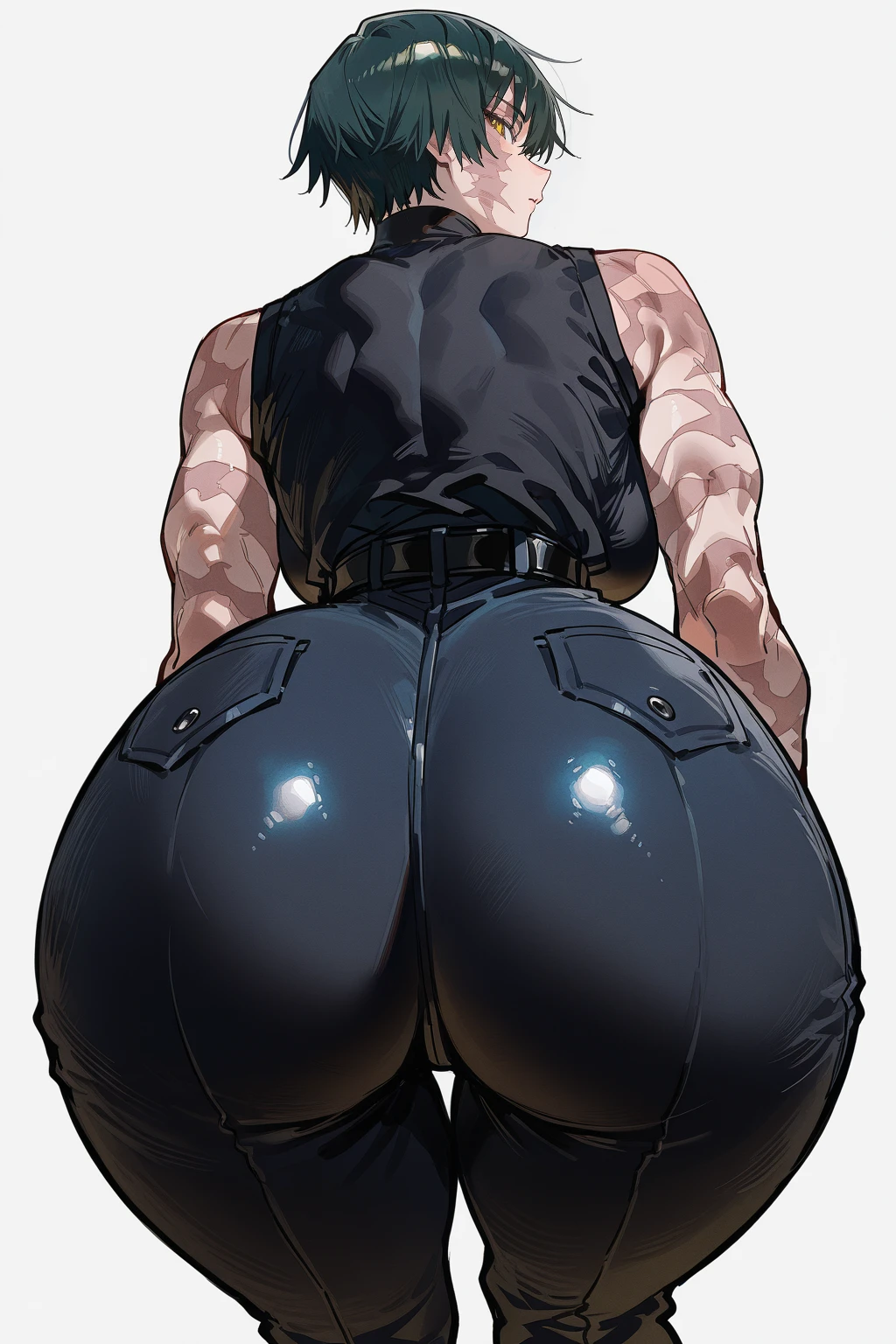 Clothes: black shirt, black pants, high-waist pants, sleeveless, black belt.