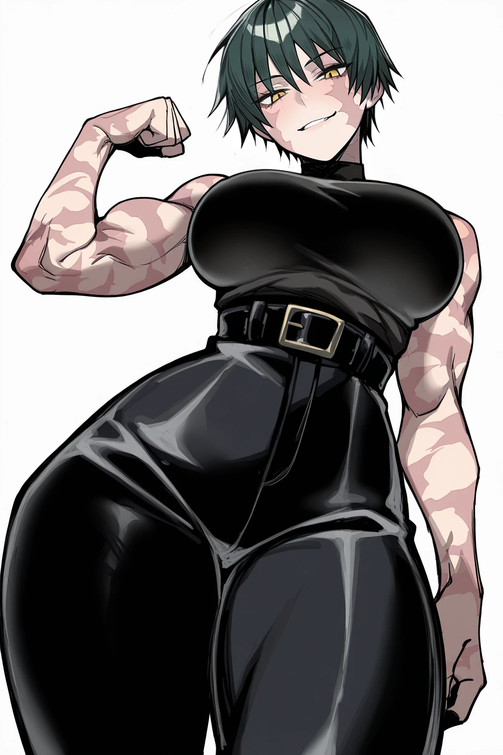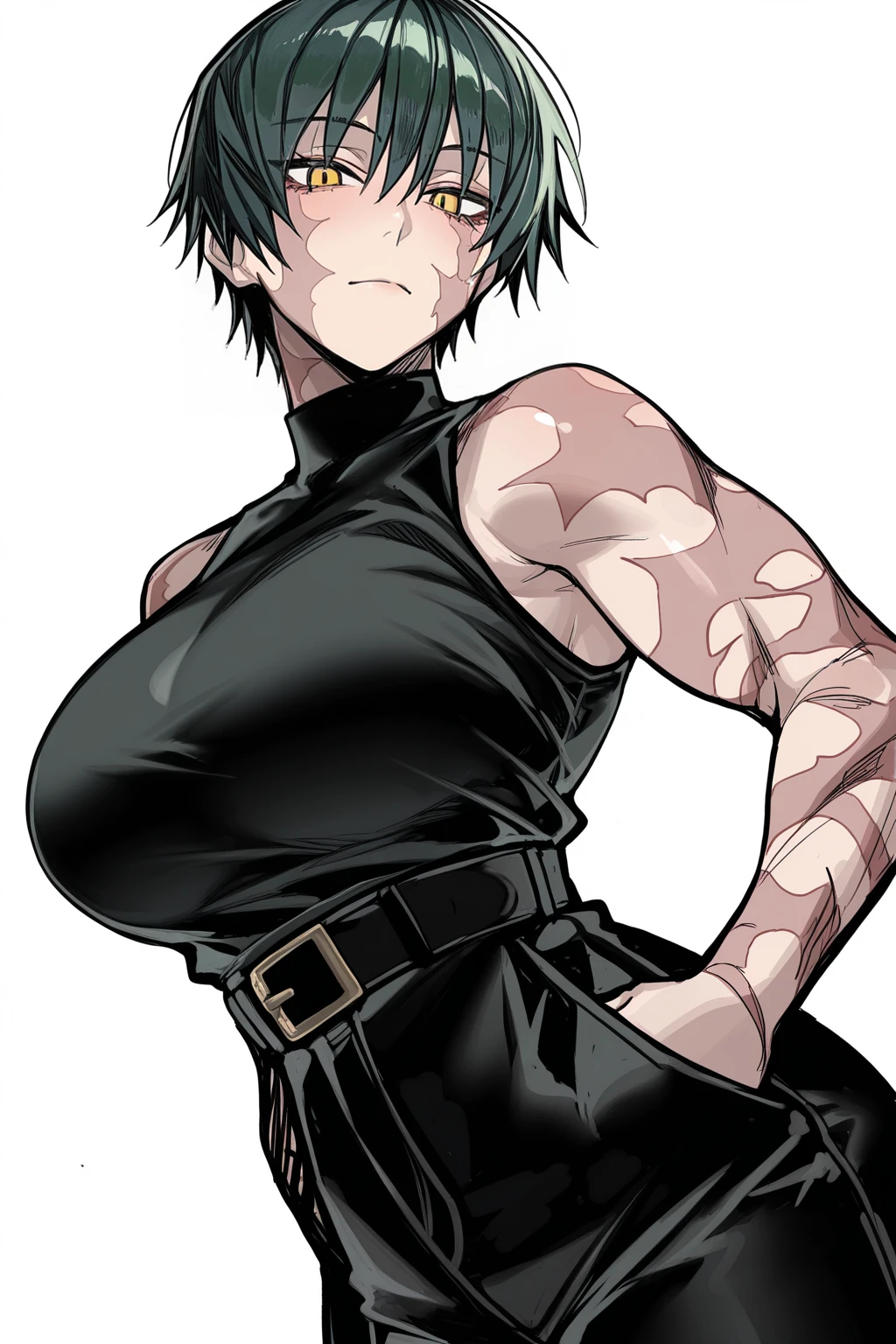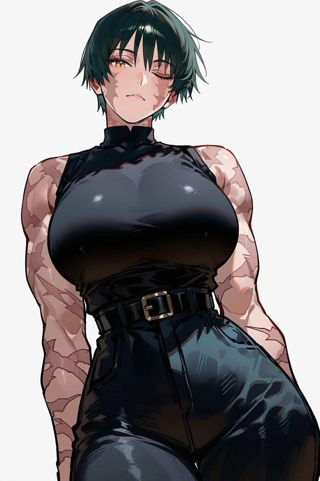 makijjk,tomboy,mature female,dark green hair,yellow eyes,short hair,scars all over,burn scar,multiple scars, scar across eye, toned