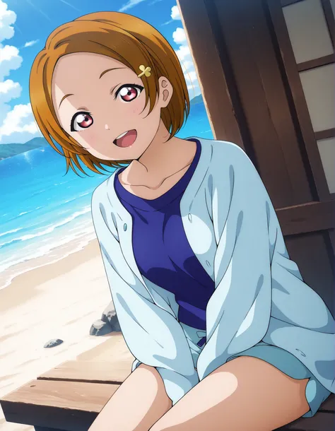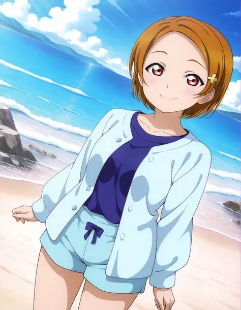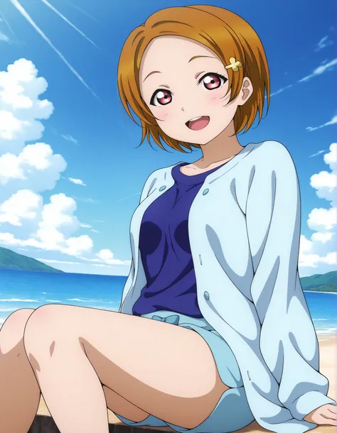 takami mito, red eyes, brown hair, short hair, hair ornament, cardigan, long sleeves, blue shirt, shorts
