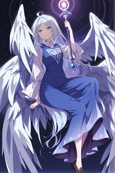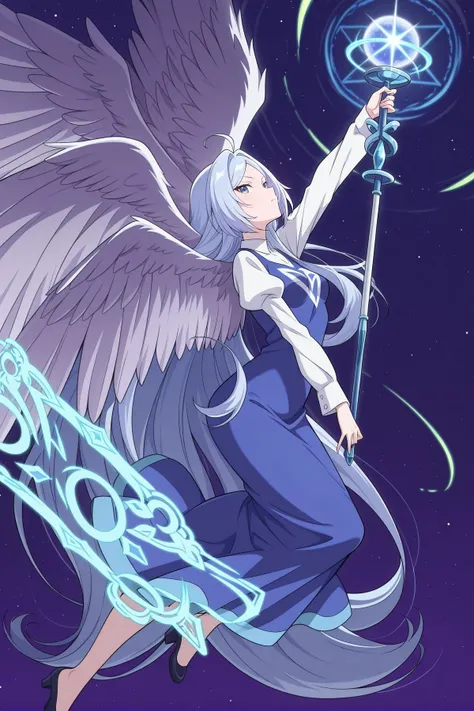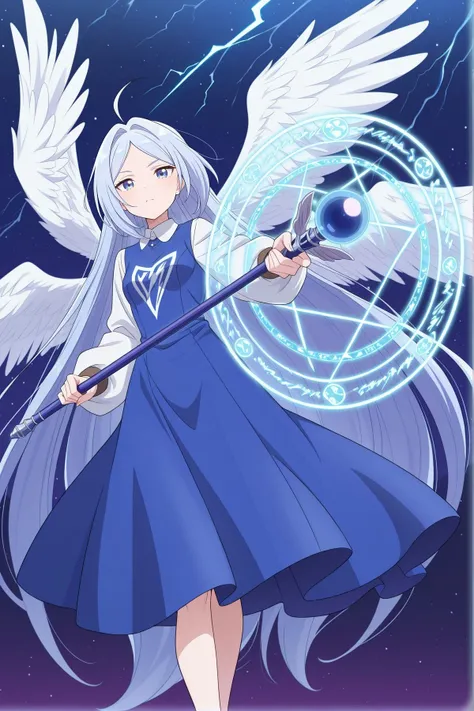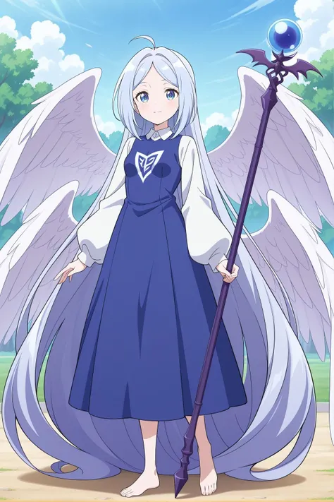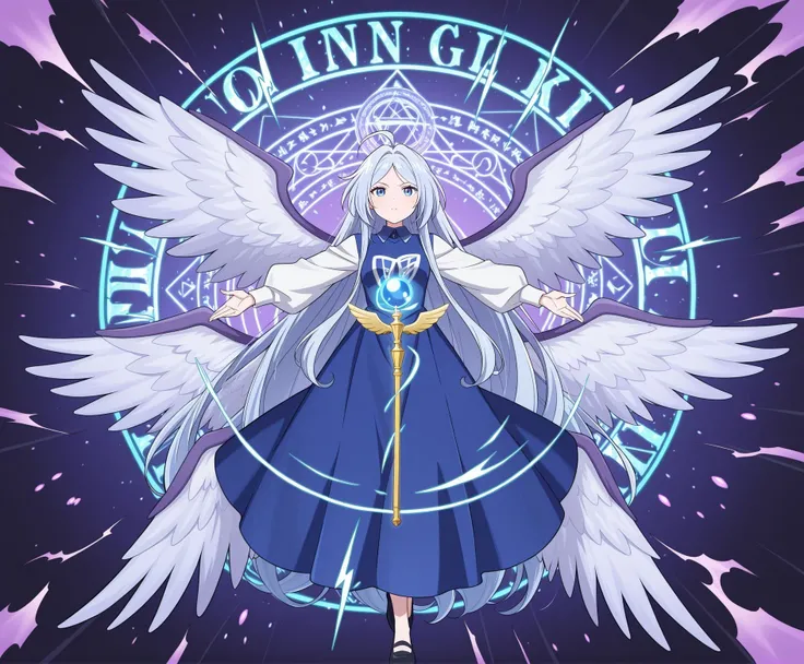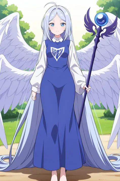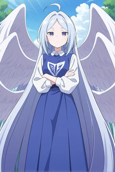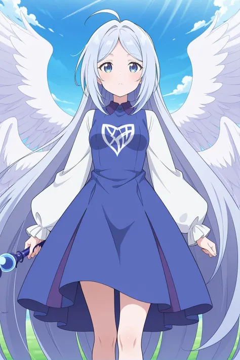 sariel, 1girl, solo, blue eyes, blue hair, absurdly long hair, parted bangs, ahoge, small breasts, angel wings, multiple wings,