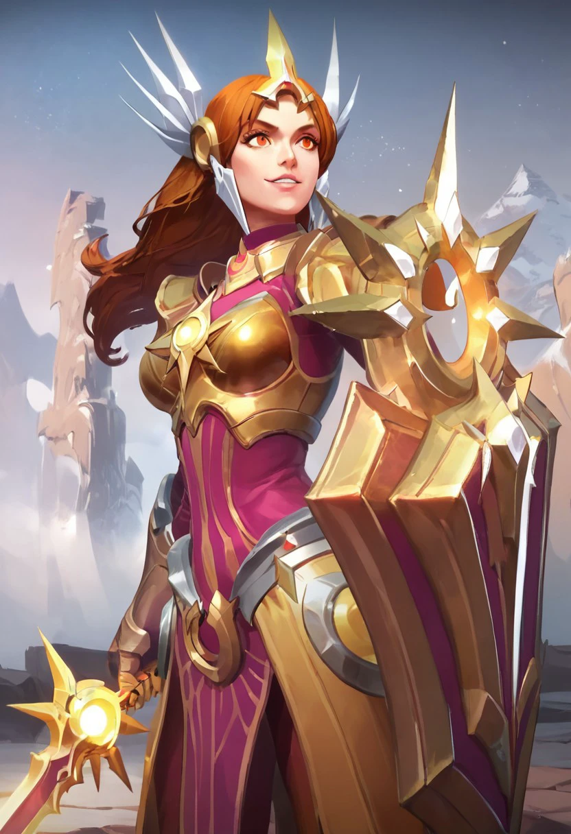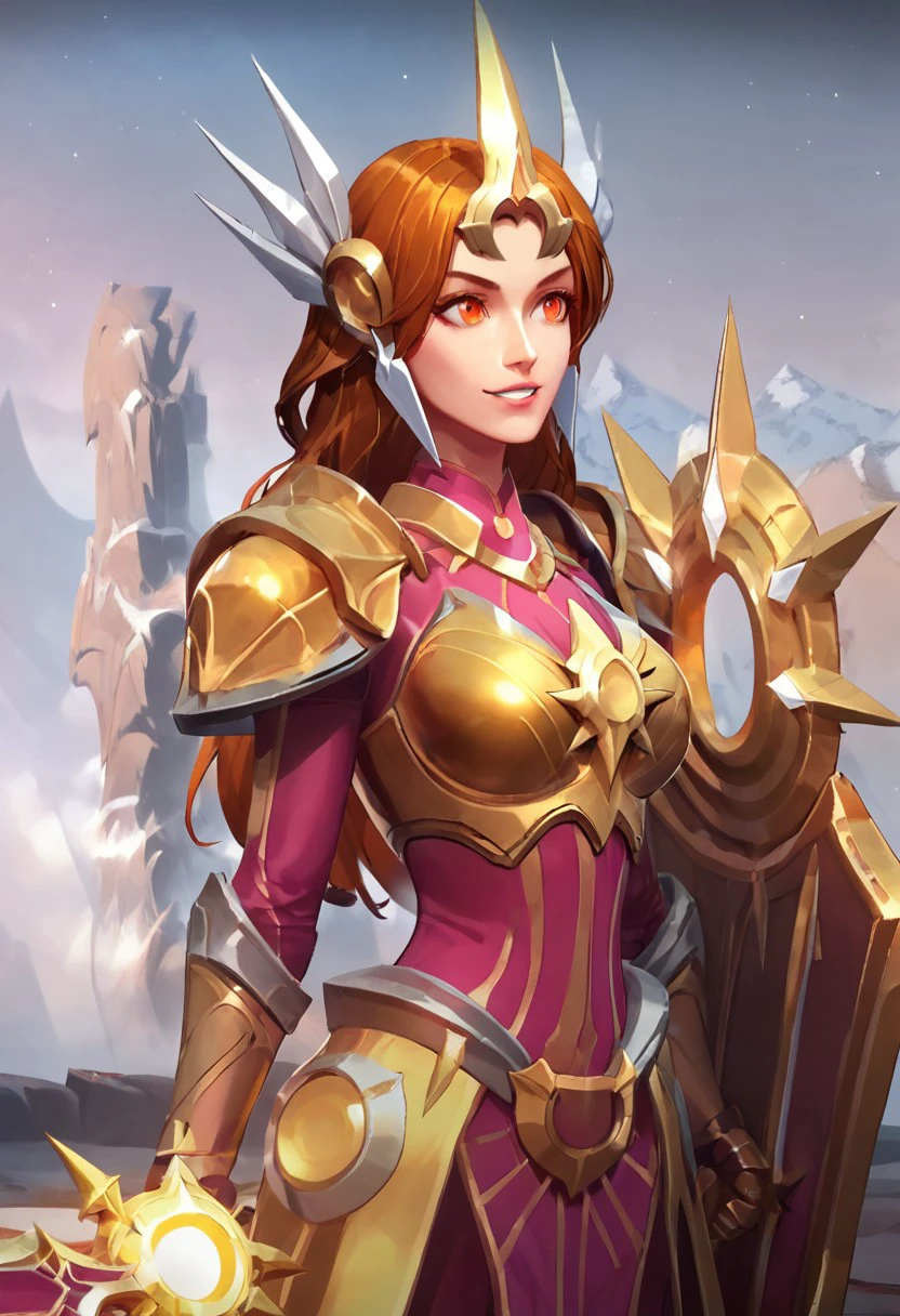 Pony/SDXL for Leona from League of Legends. Follow up to Pool Party Leona, per requestSuggested tags:Leona Armor Sword Shield Brown Hair Amber Eyes Long Hair Orange Armor Hair Accessories Crown