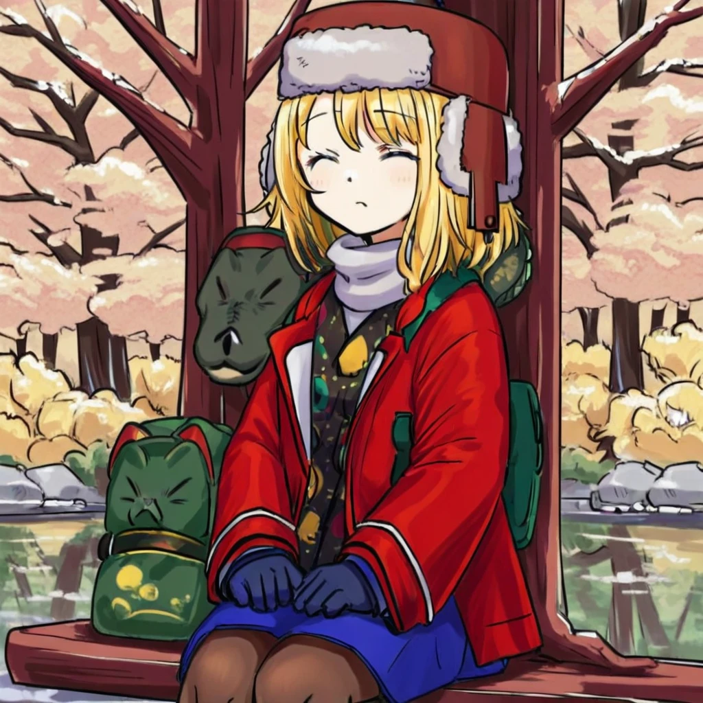 red jacket, grey shirt, coat, long sleeves, black gloves,scarf, skirt, glasses, green bag,brown pantyhose