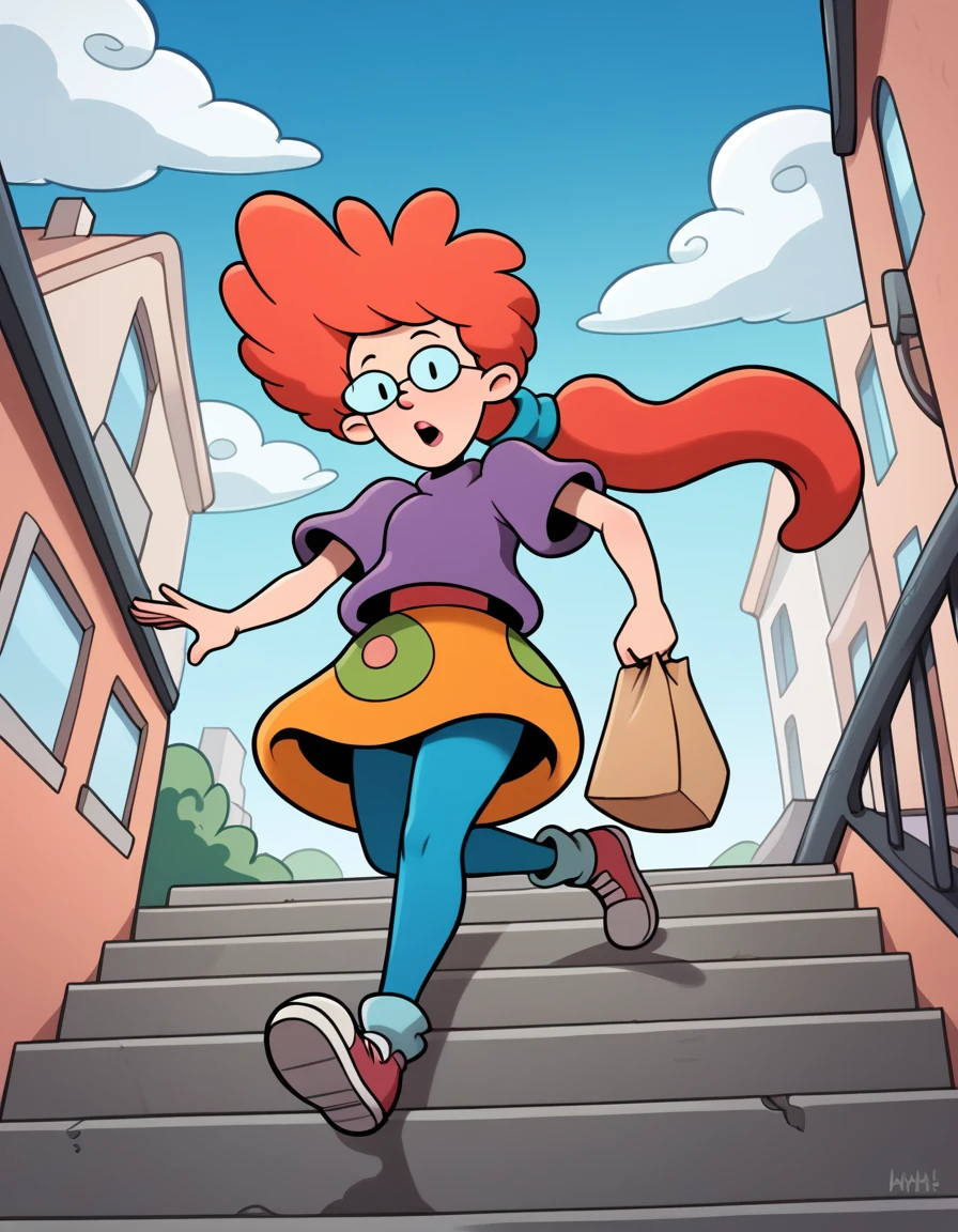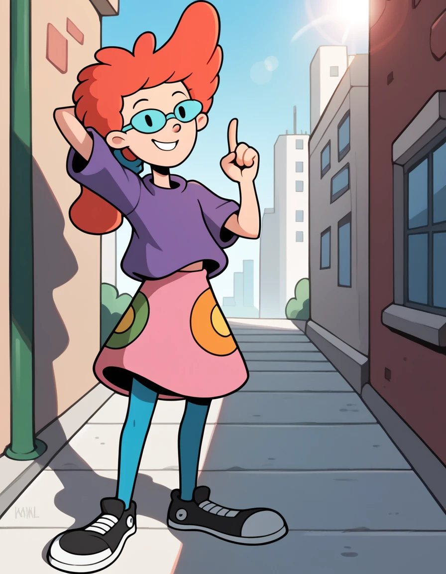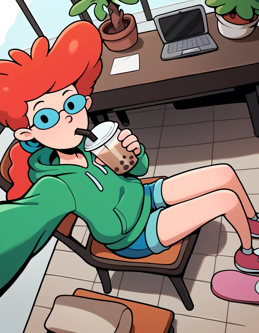 pepper ann, 1girl, red hair, long hair, ponytail, glasses
