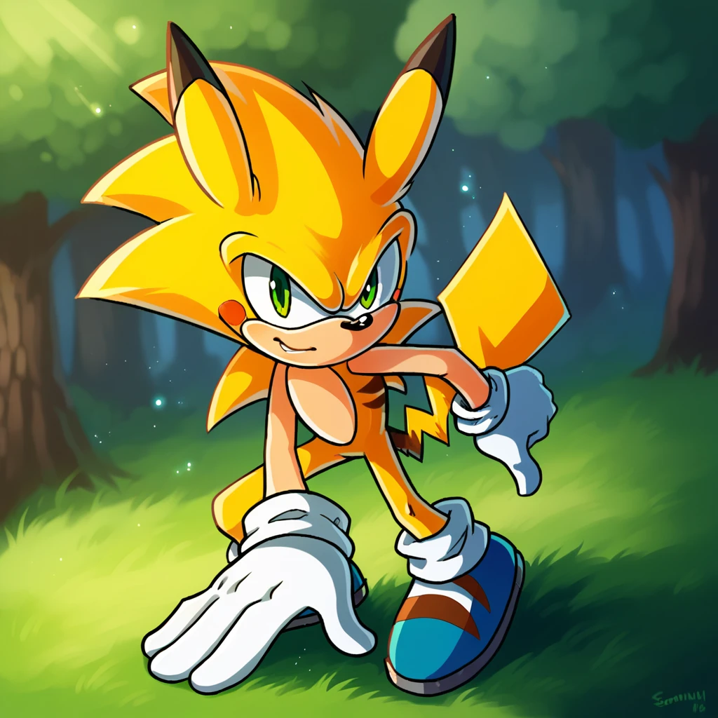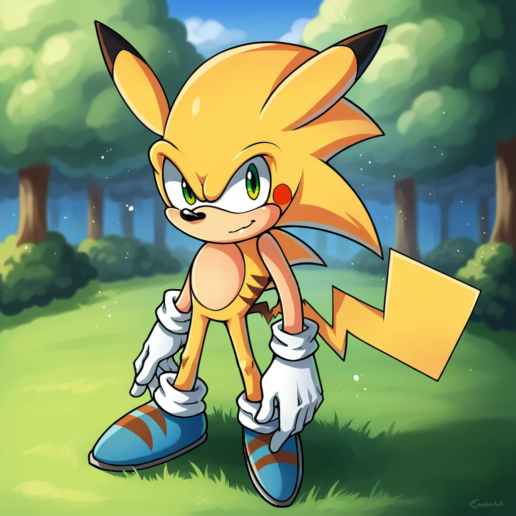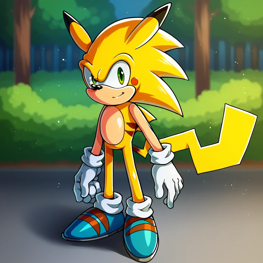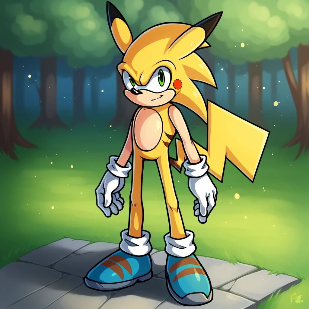 Sonichu, 1boy, solo, furry, yellow fur, green eyes, tail, white gloves, blue footwear,