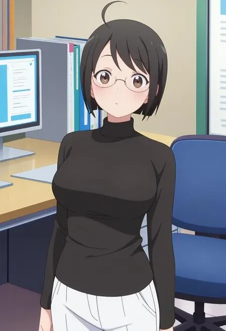 LcyYmagmi, brown eyes, black hair, short hair, bob cut, ahoge