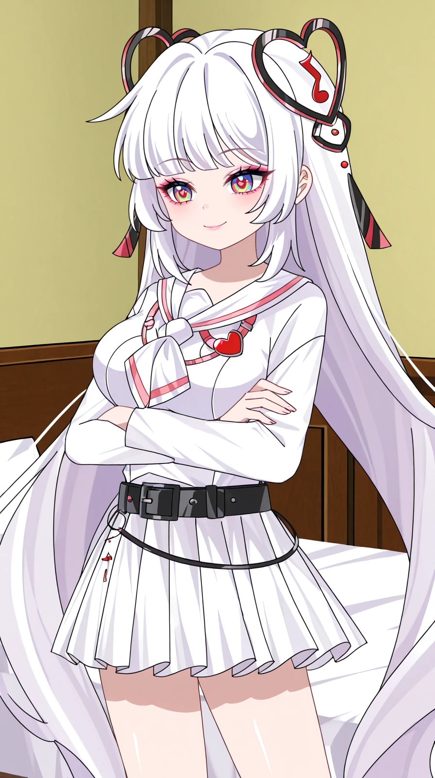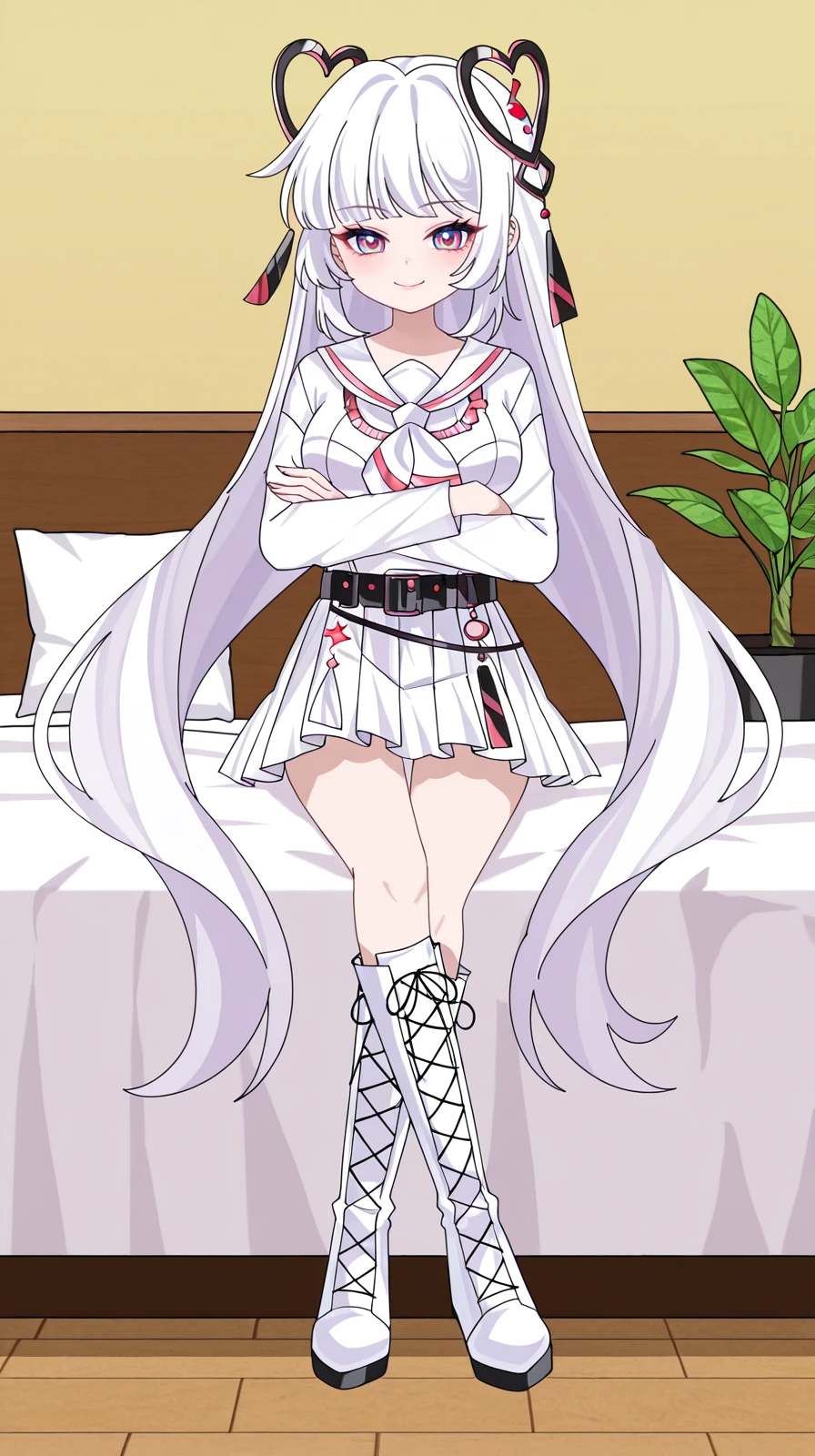 linmu, 1girl, solo, crossed arms, white hair, very long hair, white footwear, boots, sitting, crossed legs, plant, skirt, potted plant, smile, white skirt, indoors, pillow, bed, sailor collar, on bed, long sleeves, belt, hair ornament, bangs, cross-laced footwear, pink eyes, closed mouth, white shirt, shirt, pleated skirt, heart, knee boots, red eyes, high heel boots, full body, multicolored eyes, medium breasts, neckerchief