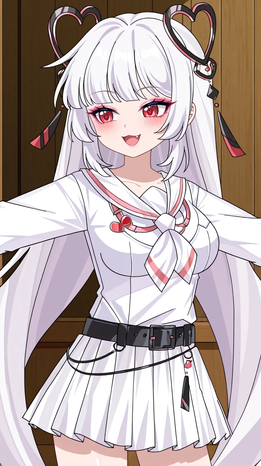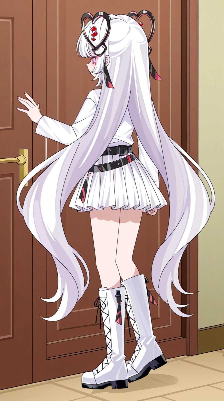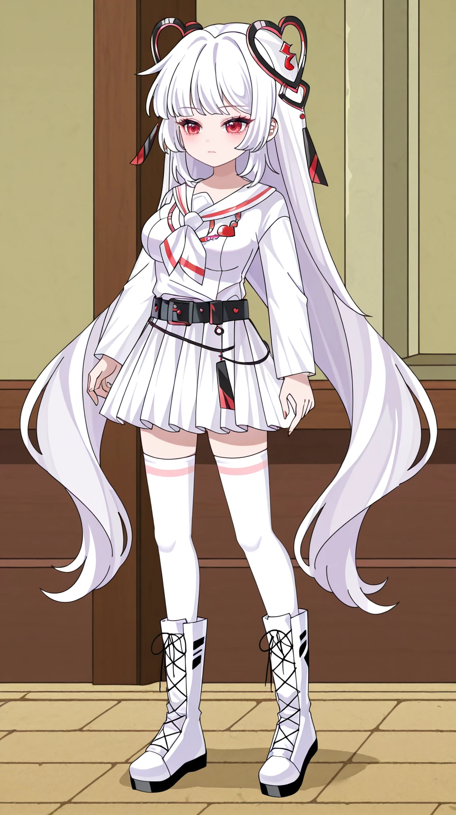 linmu, 1girl, red eyes, solo, white hair, very long hair, white footwear, boots, thighhighs, skirt, belt, medium breasts, indoors, white skirt, bangs, white thighhighs, sailor collar, long sleeves, heart, hair ornament, neckerchief, pleated skirt, full body, cross-laced footwear