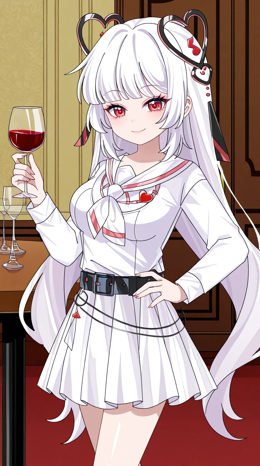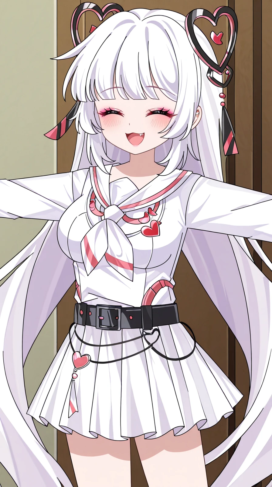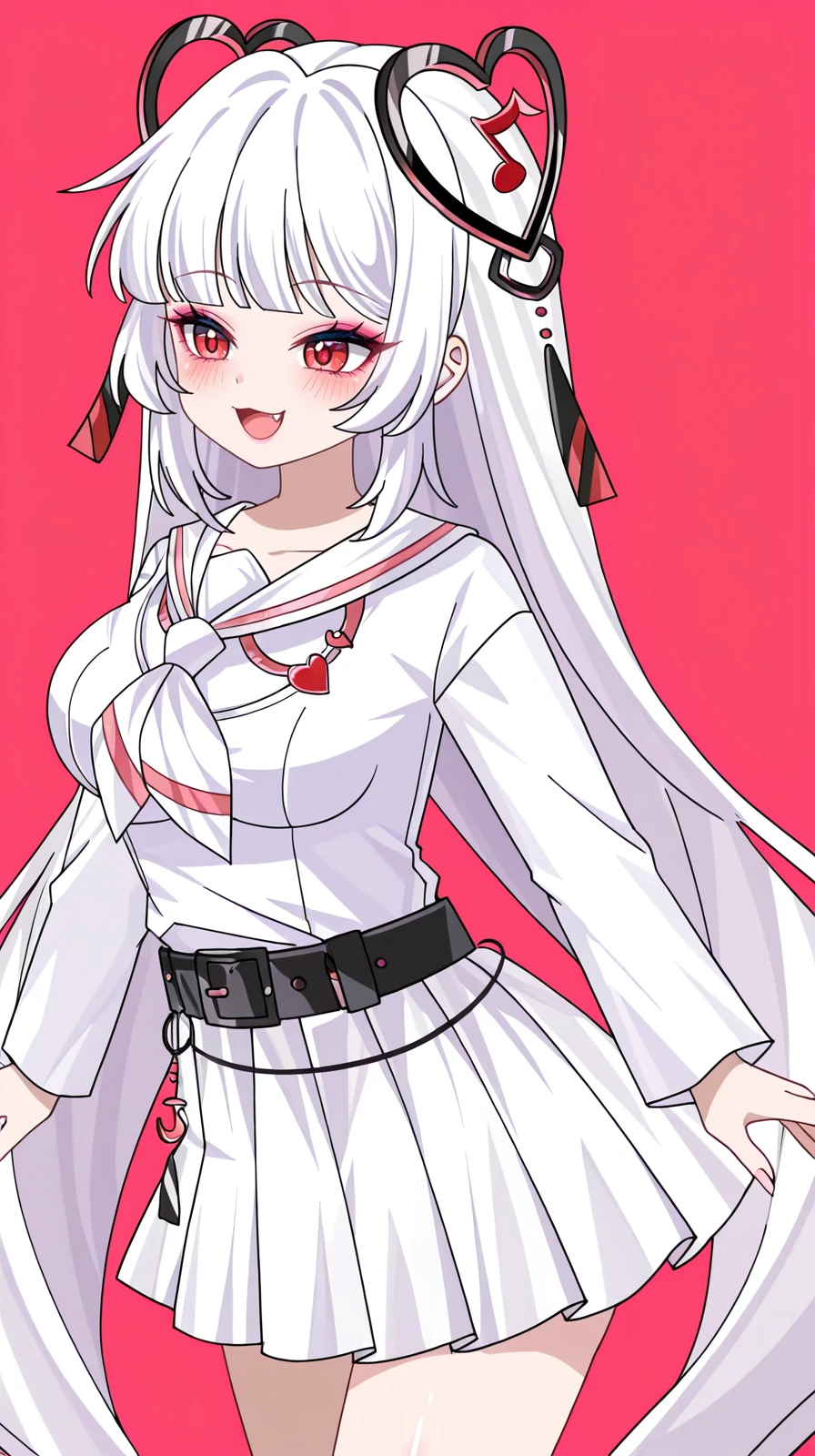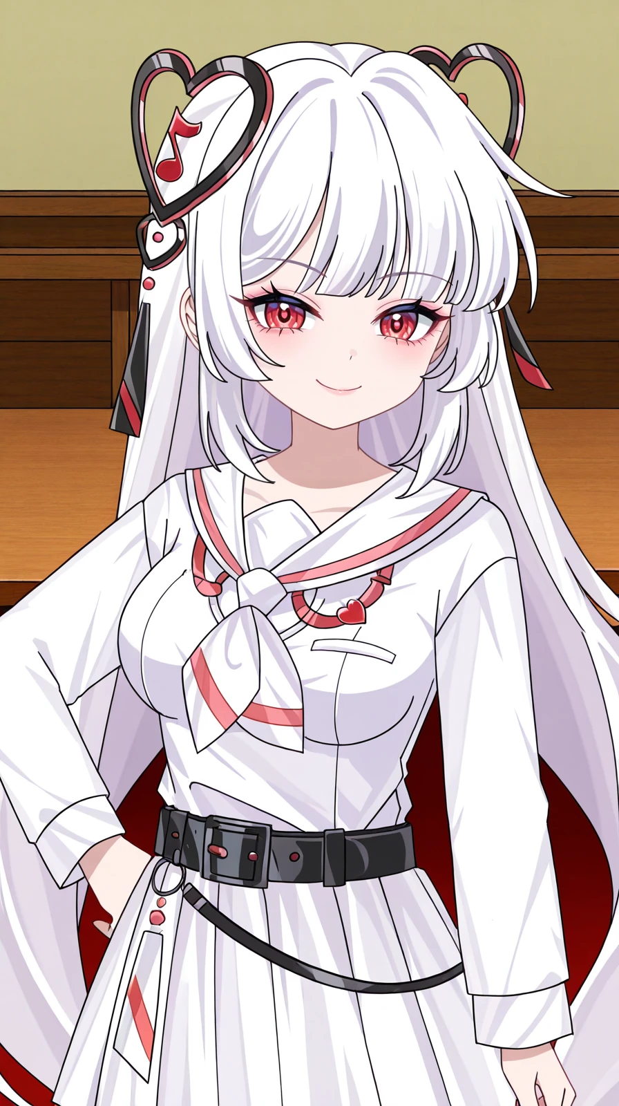 linmu, 1girl, red eyes, solo, white hair, very long hair, white footwear, boots, thighhighs, skirt, belt, medium breasts, indoors, white skirt, bangs, white thighhighs, sailor collar, long sleeves, heart, hair ornament, neckerchief, pleated skirt, full body, cross-laced footwear