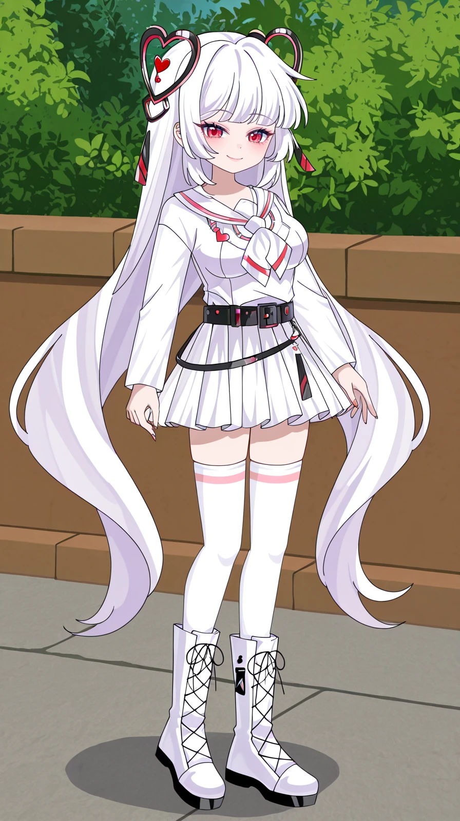 linmu, 1girl, solo, long hair, white footwear, skirt, thighhighs, boots, belt, white thighhighs, very long hair, white hair, shirt, long sleeves, white shirt, blurry background, white skirt, sailor collar, standing, closed mouth, full body, heart, bangs, blurry, pleated skirt, medium breasts, hair ornament, heart hair ornament, white sailor collar, serafuku, red eyes, neckerchief, smile, arms at sides, cross-laced footwear, ribbon, hair ribbon, multicolored eyes