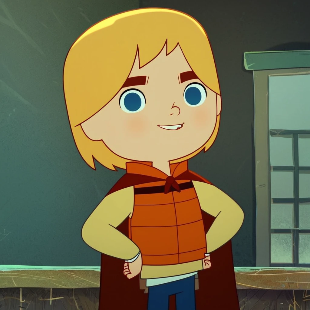 Ben from an amazing cartoon Song of the Sea, for Pony.Use strength 0.8~1.0Tags: 1boy, ben, blonde hair, blue eyes, sweater, blue pants, vest, brown cape
