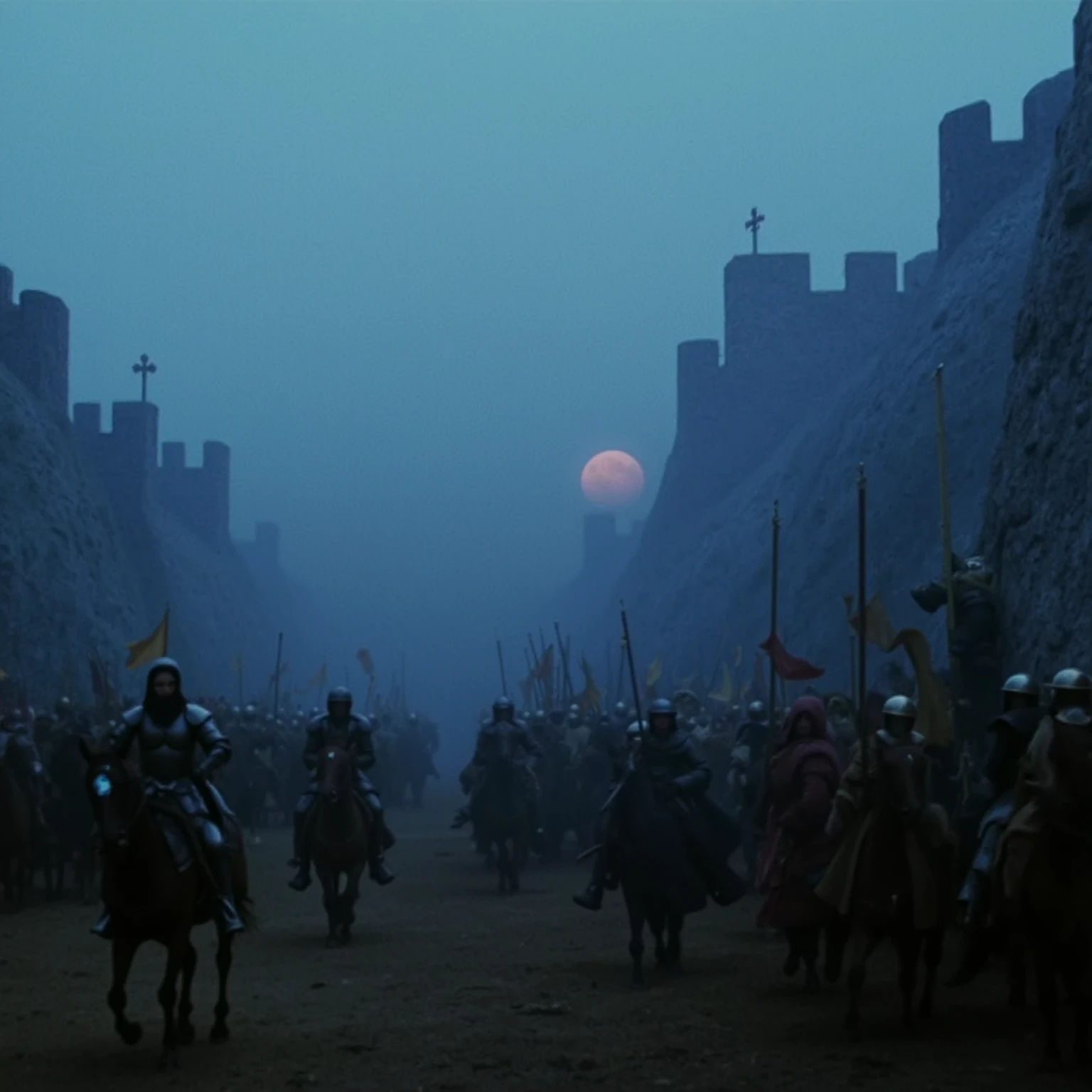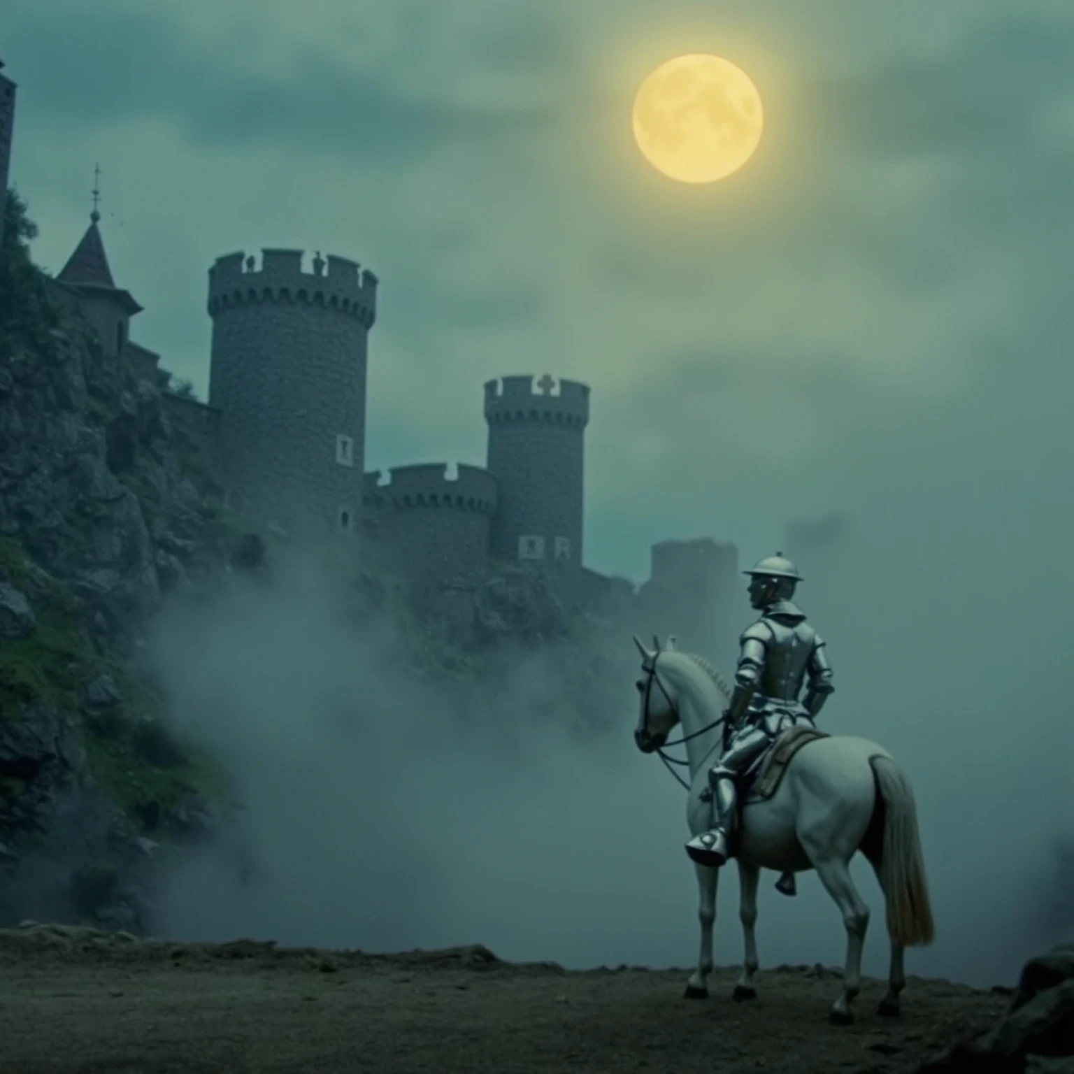 f4nt4sy a foggy moonlit landscape with a castle in the distance, there is a chrome knight riding white horse standing in the foreground, yellow moonlight.Buy me a tankard of mead.